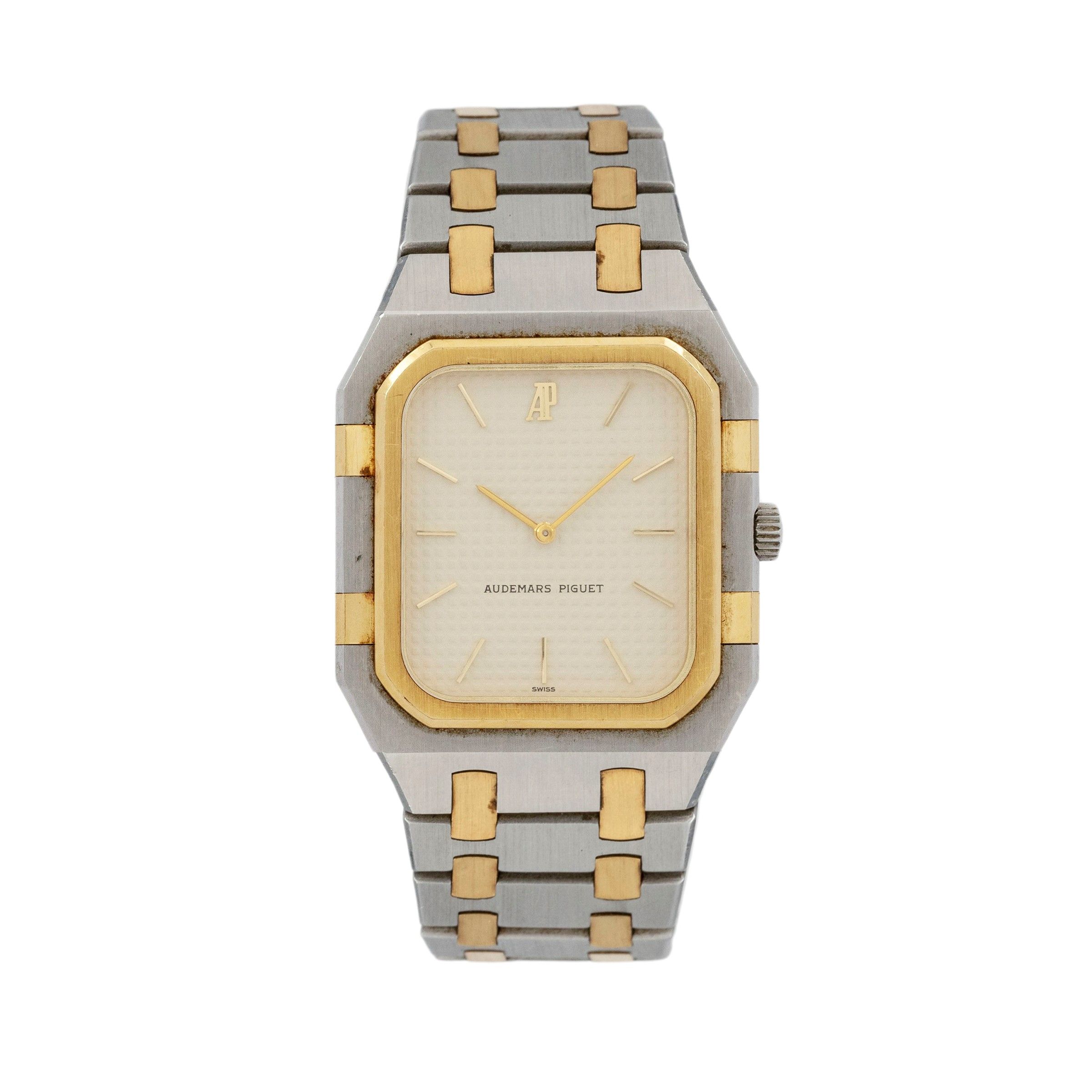 anni 80 circa in oro giallo 18kt e acciaio, ref. 2502 - B70326 ,cassa 28x38 mm. quadrante dorato con indici, vetro zaffiro, movimento al quarzo, bracciale in oro e acciaio, con chiusura deployante, cassa, quadrante e movimento firmati