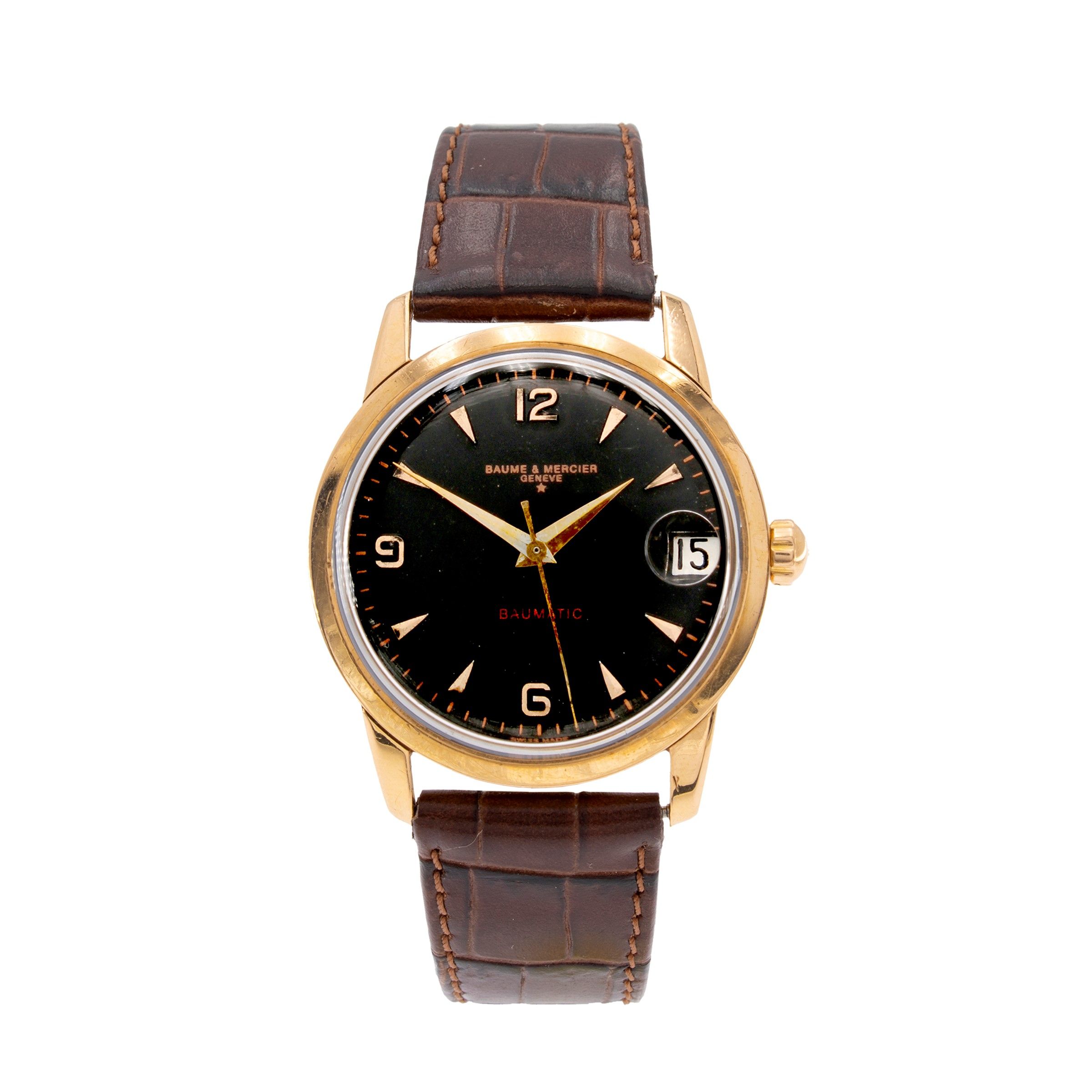 peso 41 gr. anni 70/80 in oro rosa 18kt, ref. 3154 - 159536, cassa tonda 34 mm. quadrante nero con indici e numeri arabi, datario ore 3, movimento meccanico a carica automatica, calibro 1581, completo di cinturino con fibbia in metallo dorato, cassa, quadrante e movimento firmati