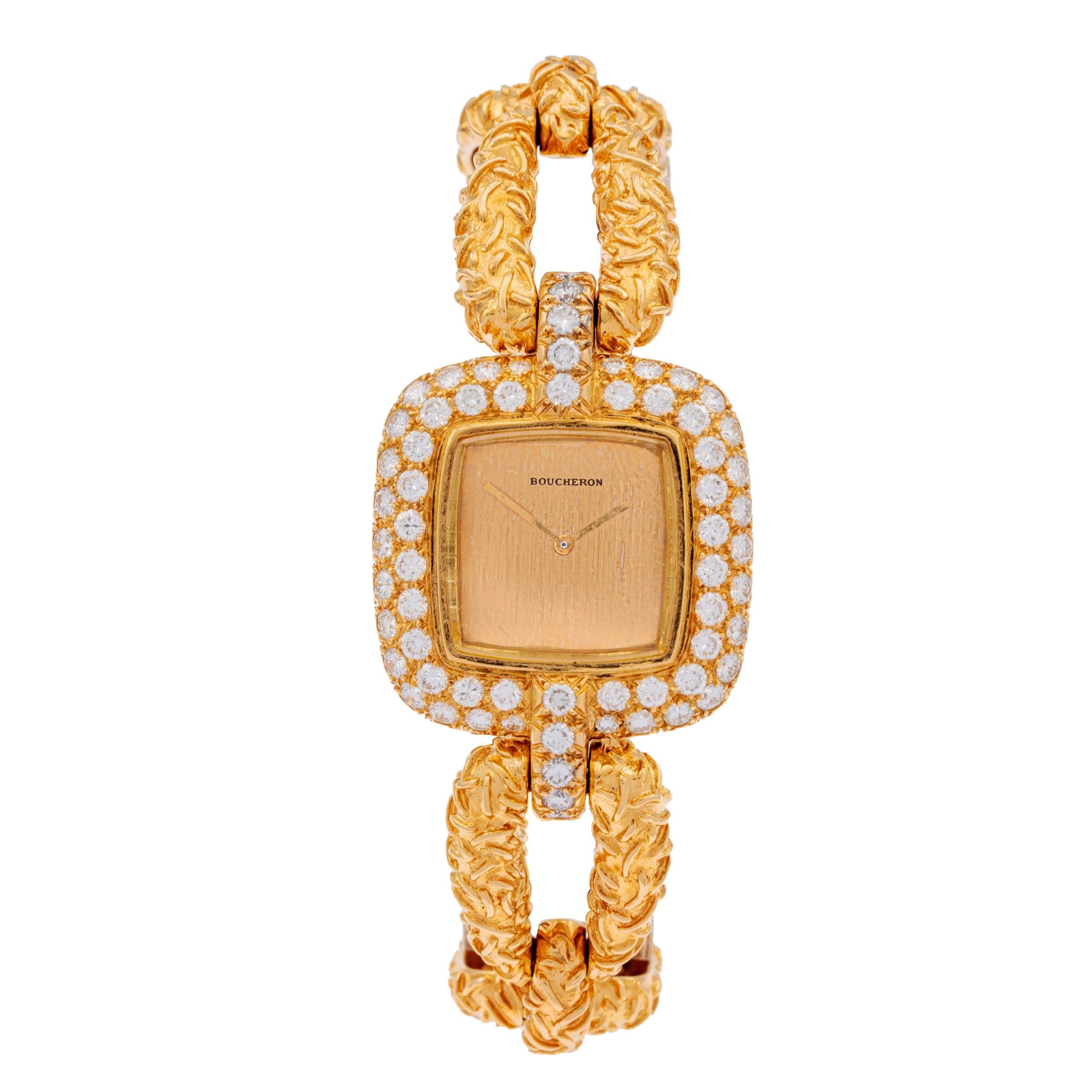 peso 76 gr. anni 70/80 in oro giallo 18kt, cassa carré 28x28 mm. contornata da diamanti taglio brillante ct 6,50 circa, quadrante champagne senza indici, movimento meccanico a carica manuale, bracciale in oro giallo 18kt, lunghezza 18 cm. cassa, quadrante e movimento firmati