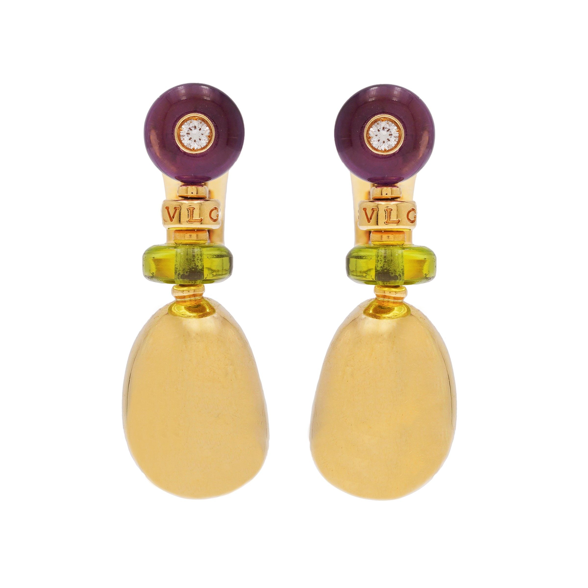 firmati, anni 90 circa in oro giallo 18kt ametiste con incastonati diamanti taglio brillante e peridoti, lunghezza 3,8 cm.