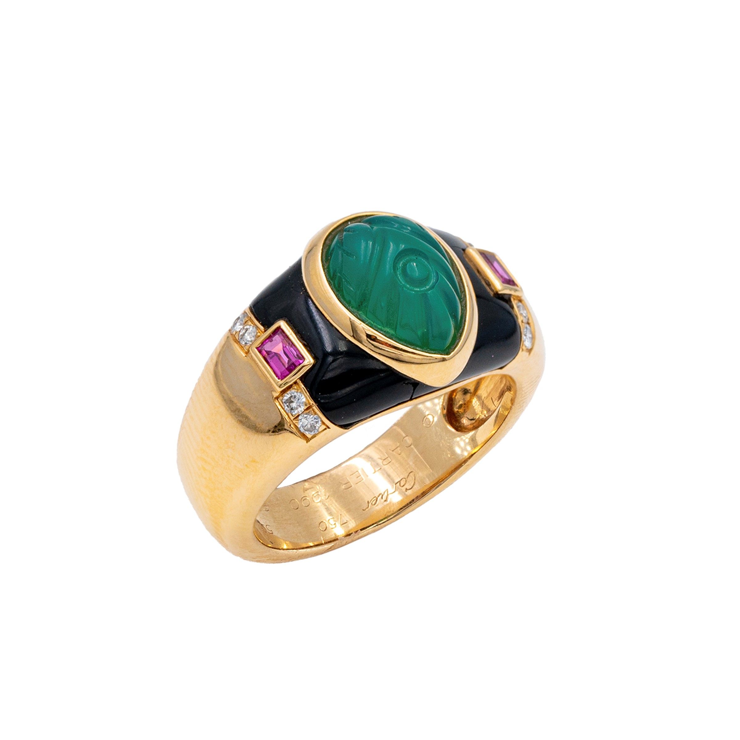 firmato, numerato e datato 1990 centrato da smeraldo inciso, onice nero, diamanti taglio brillanti e tormaline rosa, misura 13