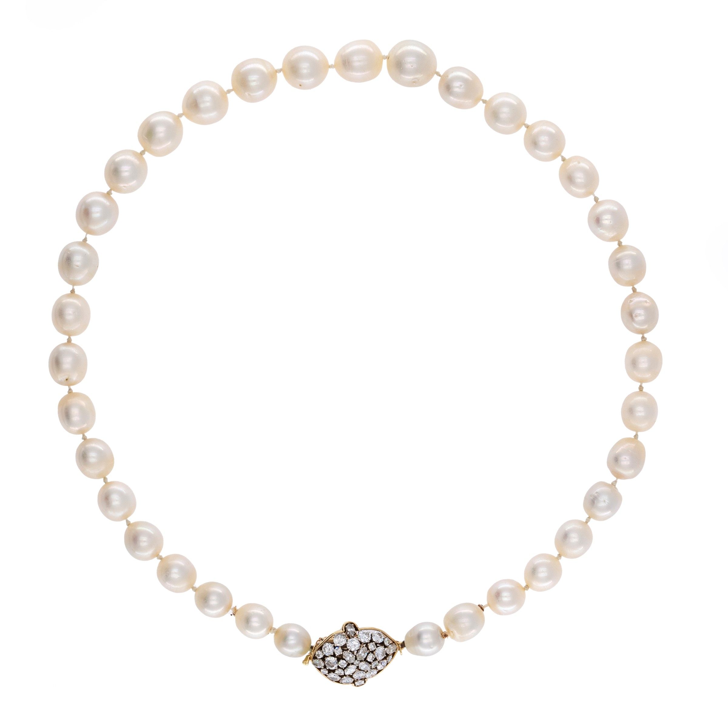 disposte a gradazione da 10 a 14 mm. circa, segni di usura, chiusura in oro giallo 18kt e diamanti taglio brillante e marquise ct 2,80 circa, lunghezza 55 cm.