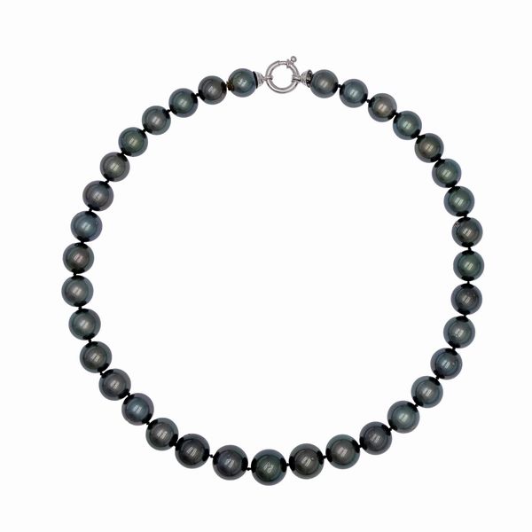disposte a gradazione da 11 a 13,5 mm. circa, chiusura in oro bianco 18kt, lunghezza 45 cm.