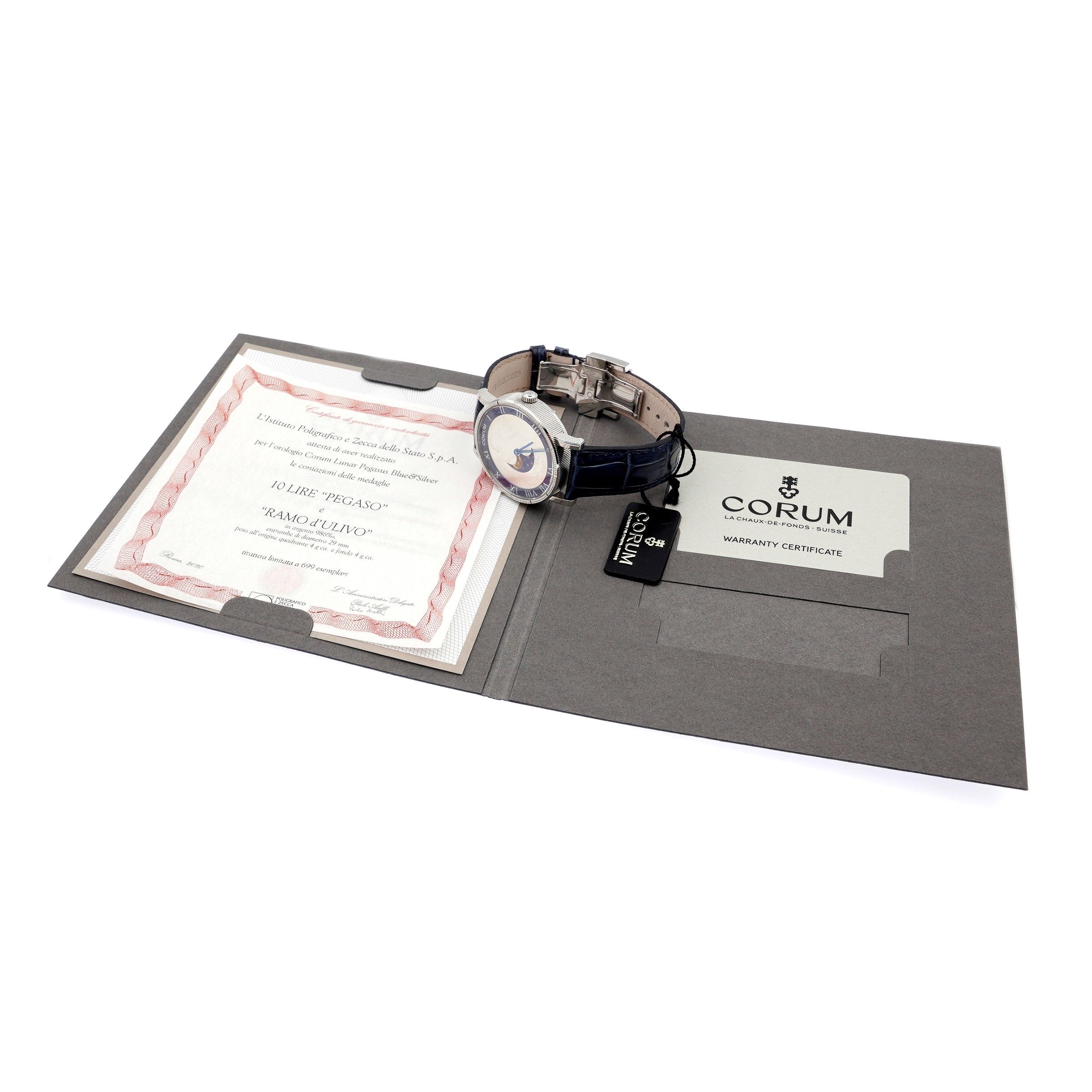edizione limitata, anno 2020 in acciaio, ref. 412.100.20/0F03ZP01, cassa tonda 40 mm. quadrante duodial con moneta 10 Lire in argento smalto blu con numeri romani, fondello con moneta Ramo d'ulivo in argento, entrambe con certificato di garanzia e autenticità della Zecca dello Stato, movimento meccanico a carica automatica, completo di cinturino con chiusura deployante in acciaio, garanzia e scatola, cassa, quadrante e movimento firmati