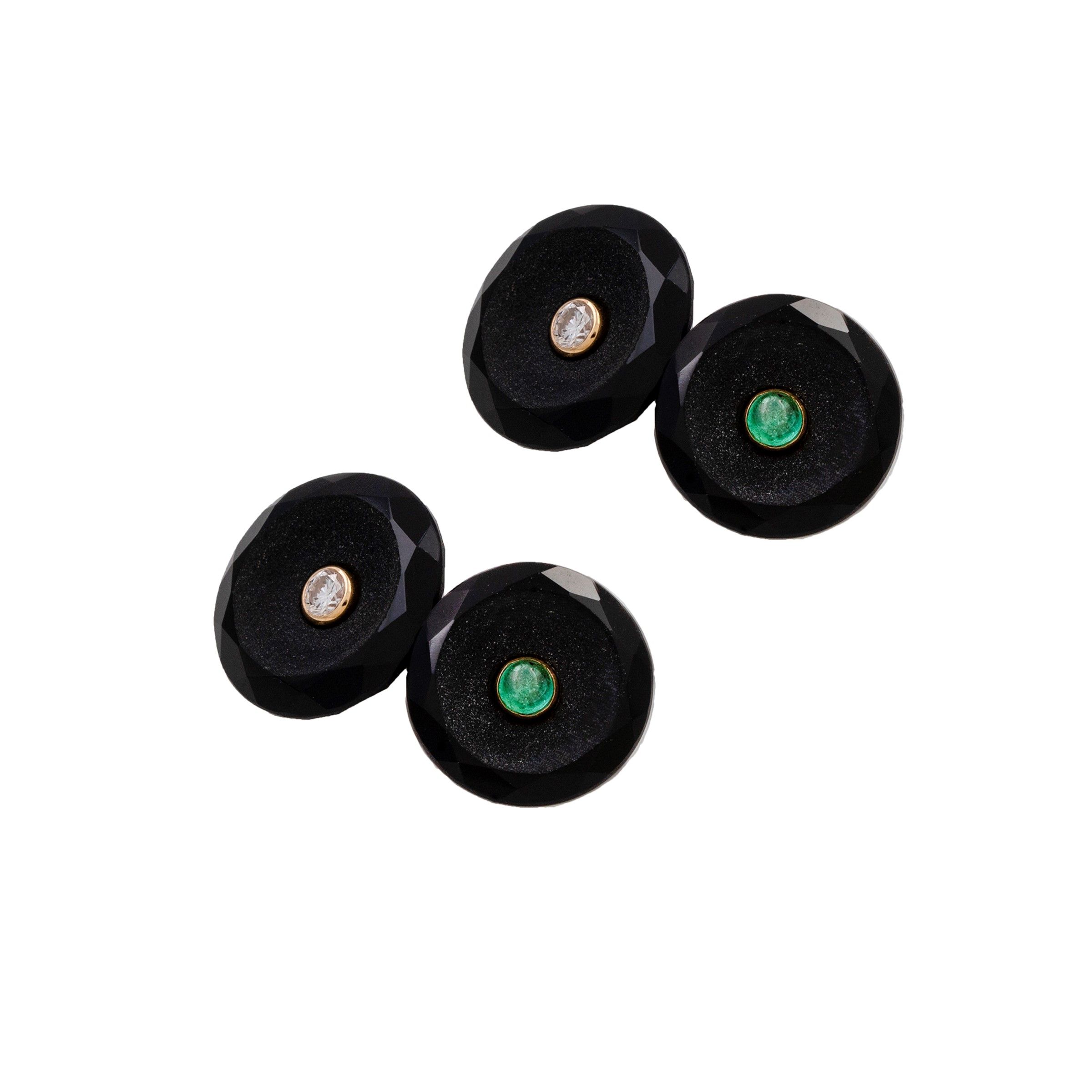 con incastonati diamanti taglio brillante antico e smeraldi taglio cabochon, diametro 1,3 cm.