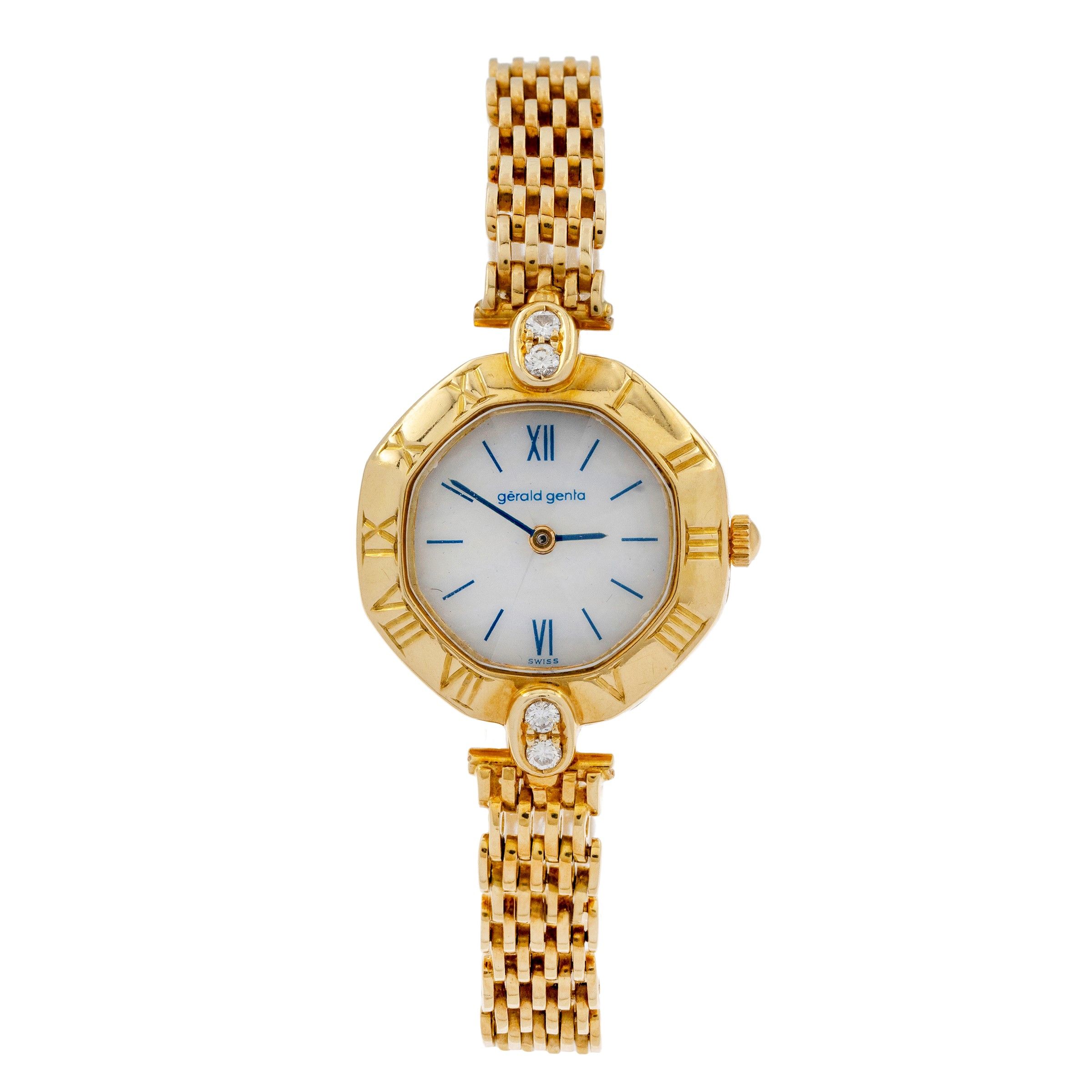 anni 90 circa in oro giallo 18kt, ref. 43181.7 - 46778, cassa ottagonale 29 mm. con numeri romani incisi e ai lati diamanti taglio brillante, quadrante bianco con indici e numeri romani, vetro zaffiro sfaccettato, movimento al quarzo, eta 956412, bracciale in oro giallo 18kt, lunghezza 18 cm. completo di scatola e garanzia, cassa, quadrante e movimento firmati