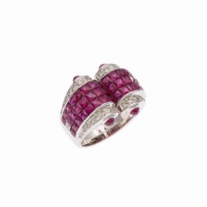 peso 14 gr. rubini taglio cabochon e carré incastonatura invisibile ct 6,50 circa e diamanti taglio brillante, [..]