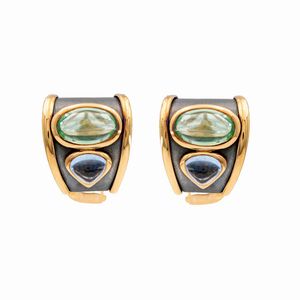 peso 26 gr. firmati e numerati in oro giallo 18kt e oro brunito con zaffiro e prasiolite verde taglio cabochon, [..]
