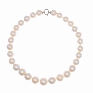 peso 132 gr. disposte a gradazione da 13 a 17 mm. circa, chiusura in oro bianco 18kt, lunghezza 46 cm.