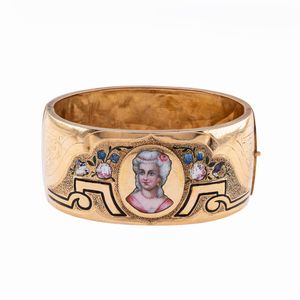 Antico bracciale a manetta in oro giallo e miniatura in smalto policromo