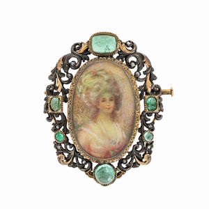 peso 18 gr. primi 900 taglio cabochon, centrata da miniatura raffigurante ritratto femminile firmata Ferrante, [..]