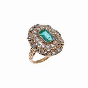 Antico anello in oro e argento smeraldo e rose coroné