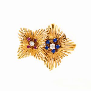 peso 9 gr. anni 40/50 diamanti taglio brillante antico ct 0,20 circa e rubini e zaffiri di sintesi, dimensioni [..]