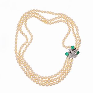 peso 66 gr. disposte a gradazione da 5,5 a 7 mm. circa, chiusura laterale in oro bianco 18kt, tre smeraldi taglio [..]