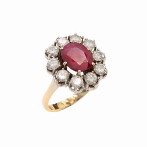 peso 7 gr. rubino taglio ovale sfaccettato ct 1,60 circa, contornato da diamanti taglio brillante ct 0,80 circa, [..]