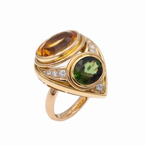 Anello in oro giallo 18kt quarzo citrino e peridoto