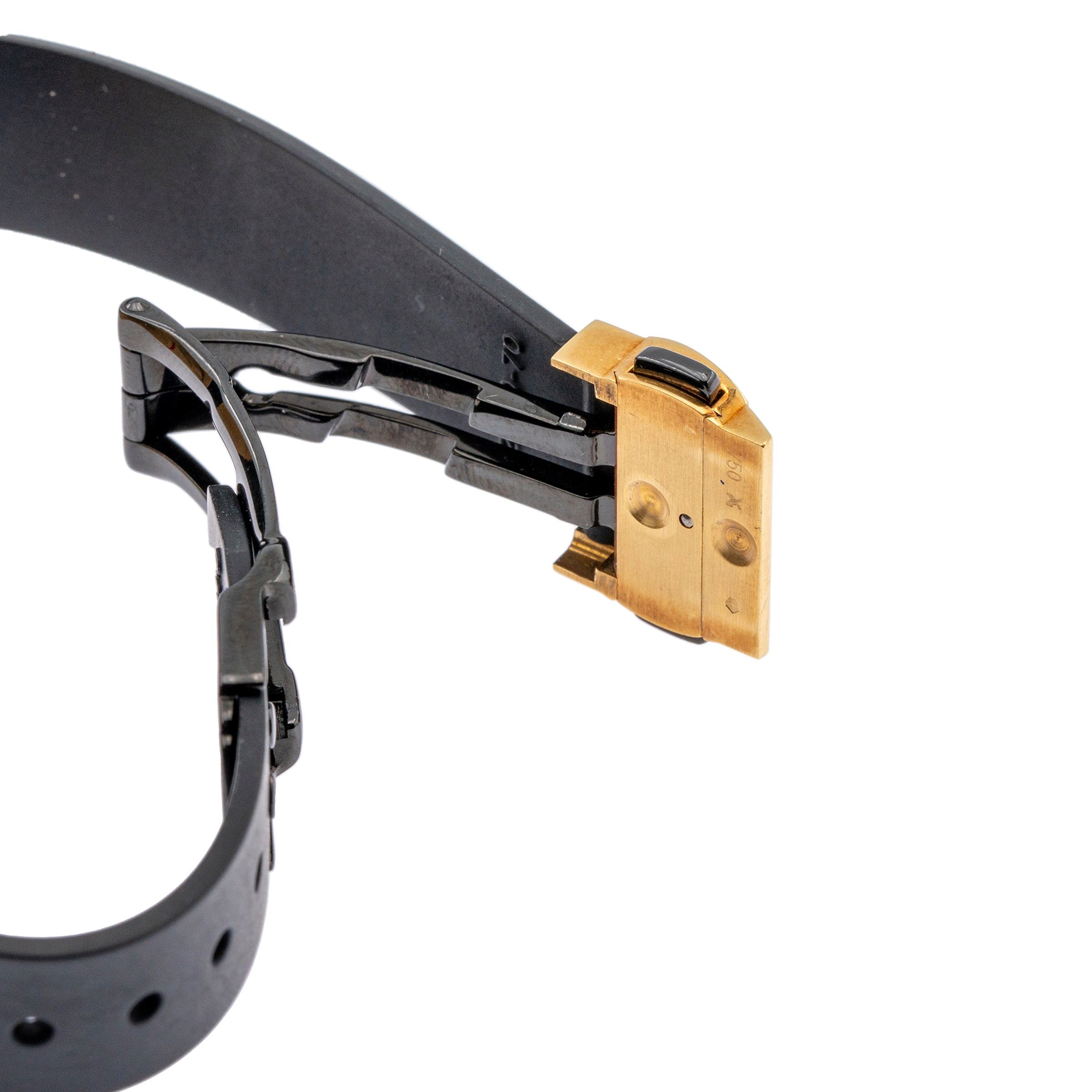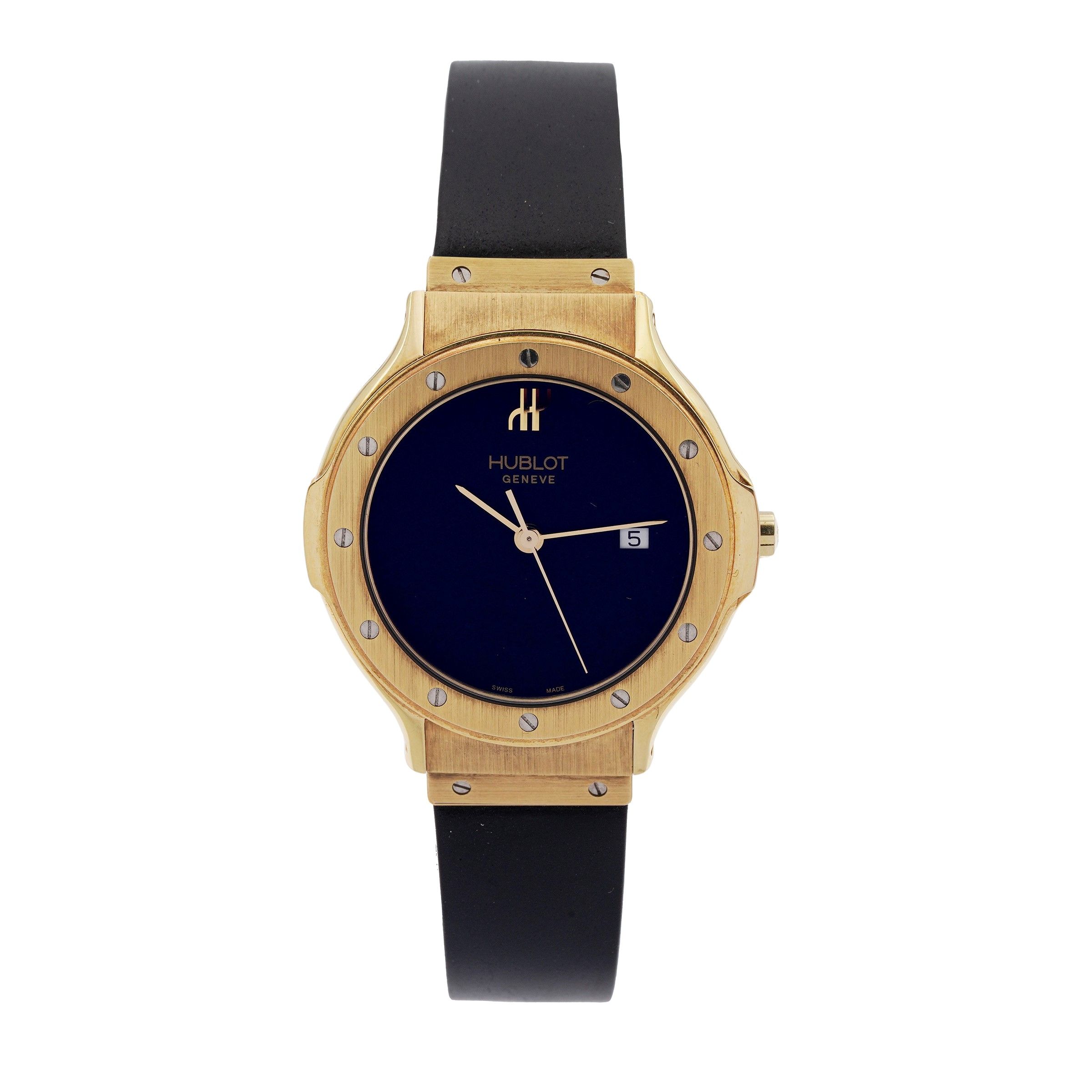 peso 60 gr. anni 2000 in oro giallo 18kt, ref. 1403.3/668528, cassa tonda 32 mm. quadrante nero senza indici, datario ore 3, vetro al quarzo, movimento al quarzo, cinturino originale di gomma con chiusura deployante in oro giallo 18kt, cassa, quadrante e movimento firmati