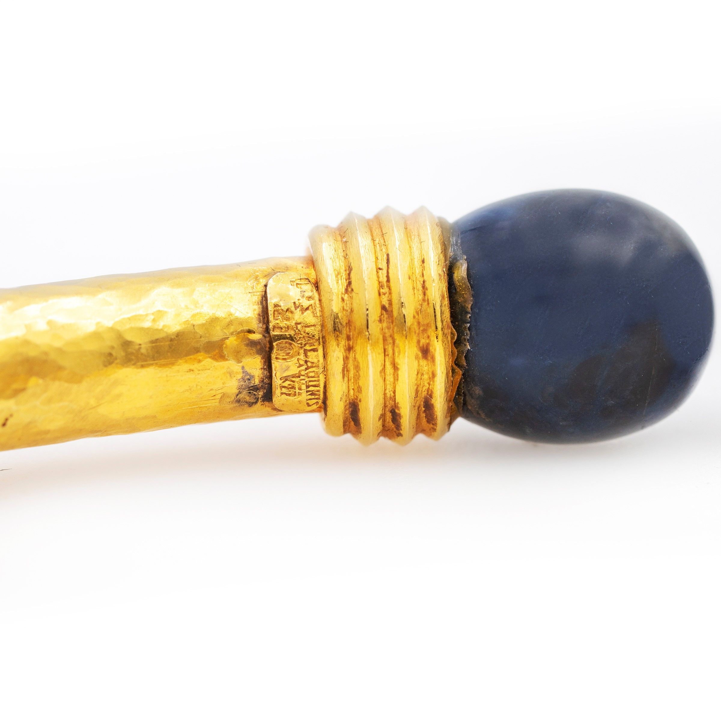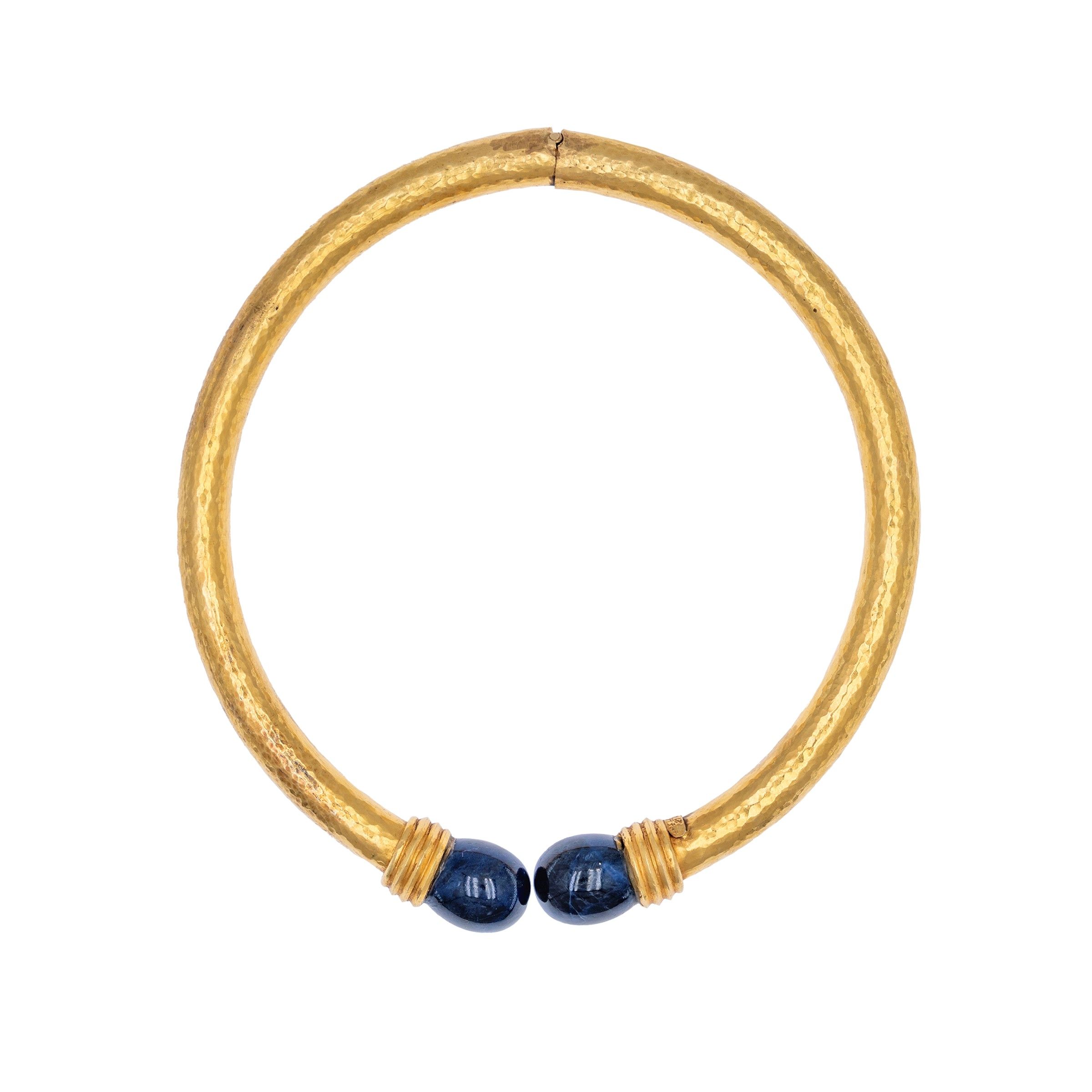 firmati e numerati, anni 70 circa in oro giallo martellato 18kt terminali in lapislazzulo, apertura a molla, choker lunghezza 42 cm. - bracciale diametro 6 cm. completa di scatola