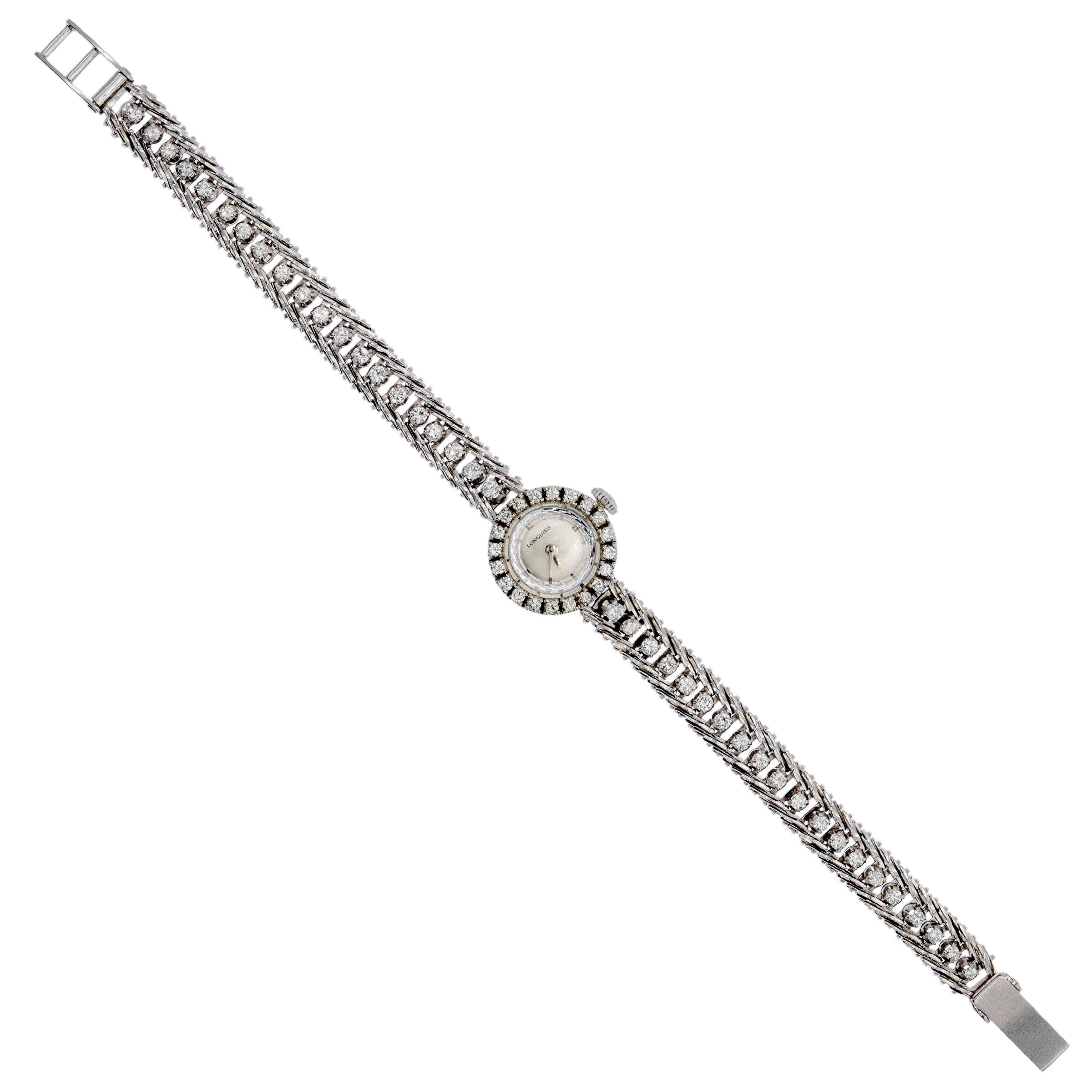 peso 36 gr. anni 60 circa in oro bianco 18kt, cassa 17 mm. contornata da diamanti taglio brillante, quadrante argentato, movimento meccanico a carica manuale, bracciale a spina di pesce in oro bianco e diamanti taglio brillante ct 1,10 circa, lunghezza 19 cm. regolabile, cassa, quadrante e movimento firmati