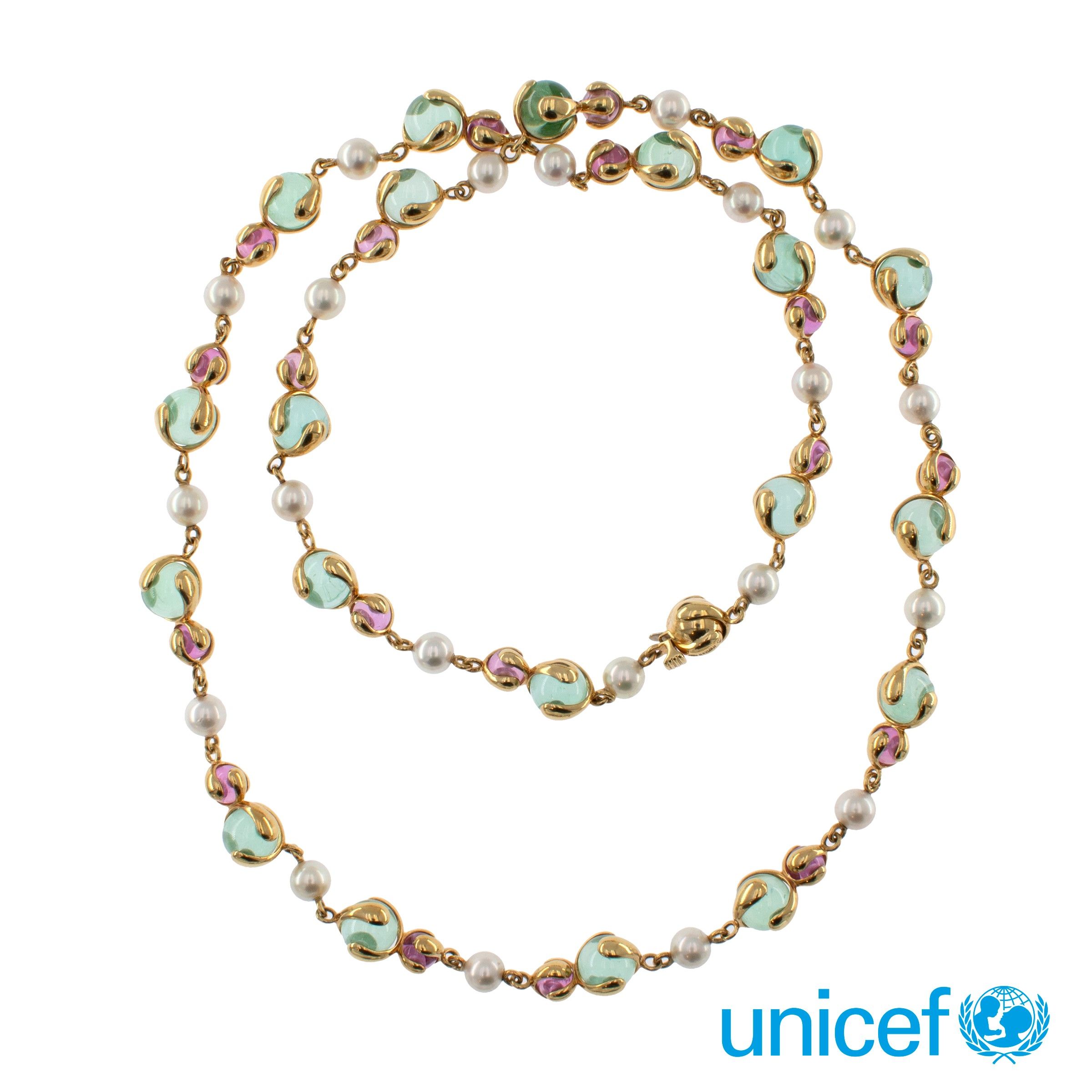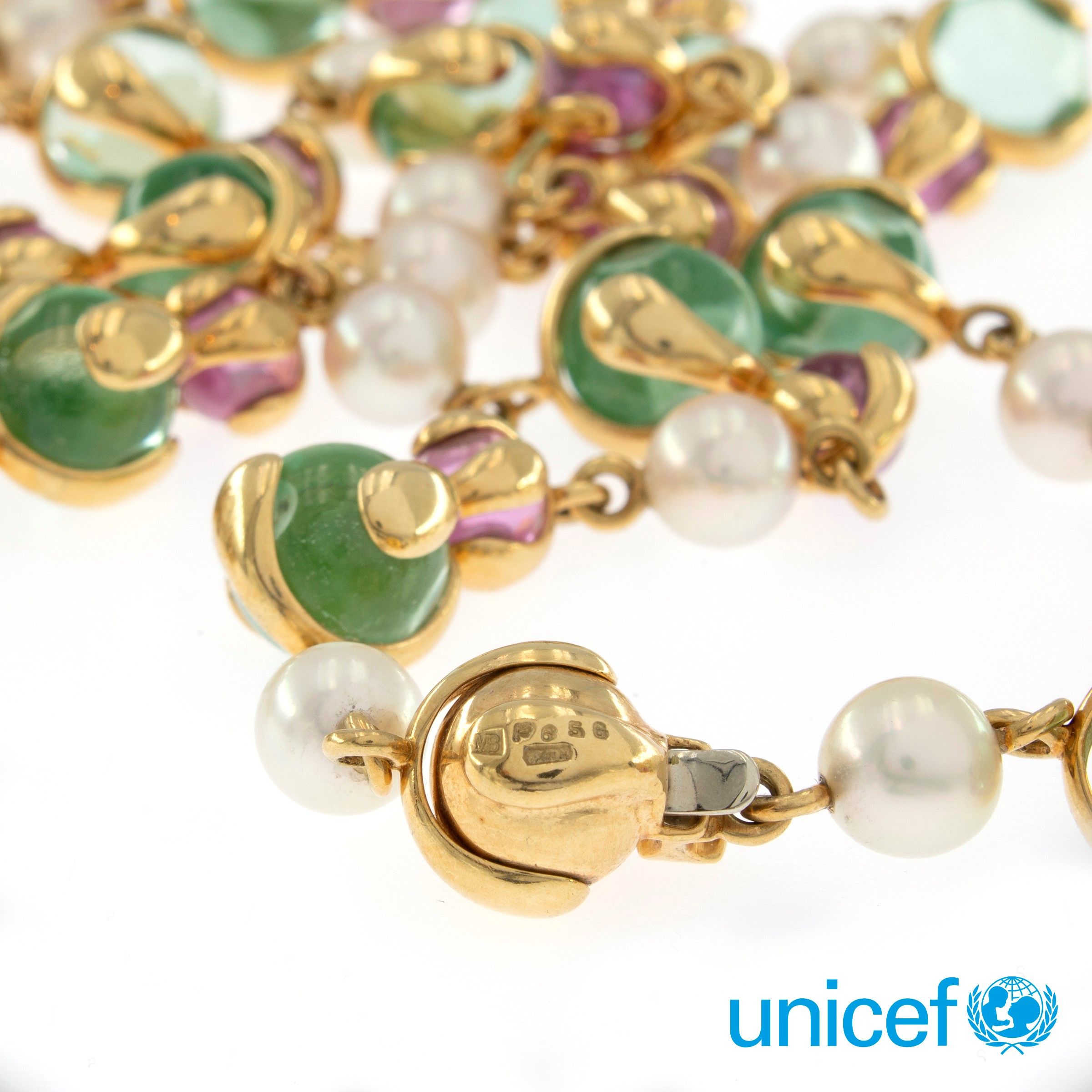 peso 152 gr. firmata e numerata, anno 1988 in oro giallo 18kt con sfere di quarzo russo rosa e verde e perle coltivate, chiusura a sfera in oro giallo, lunghezza 78 cm. completo di custodia in tessuto.