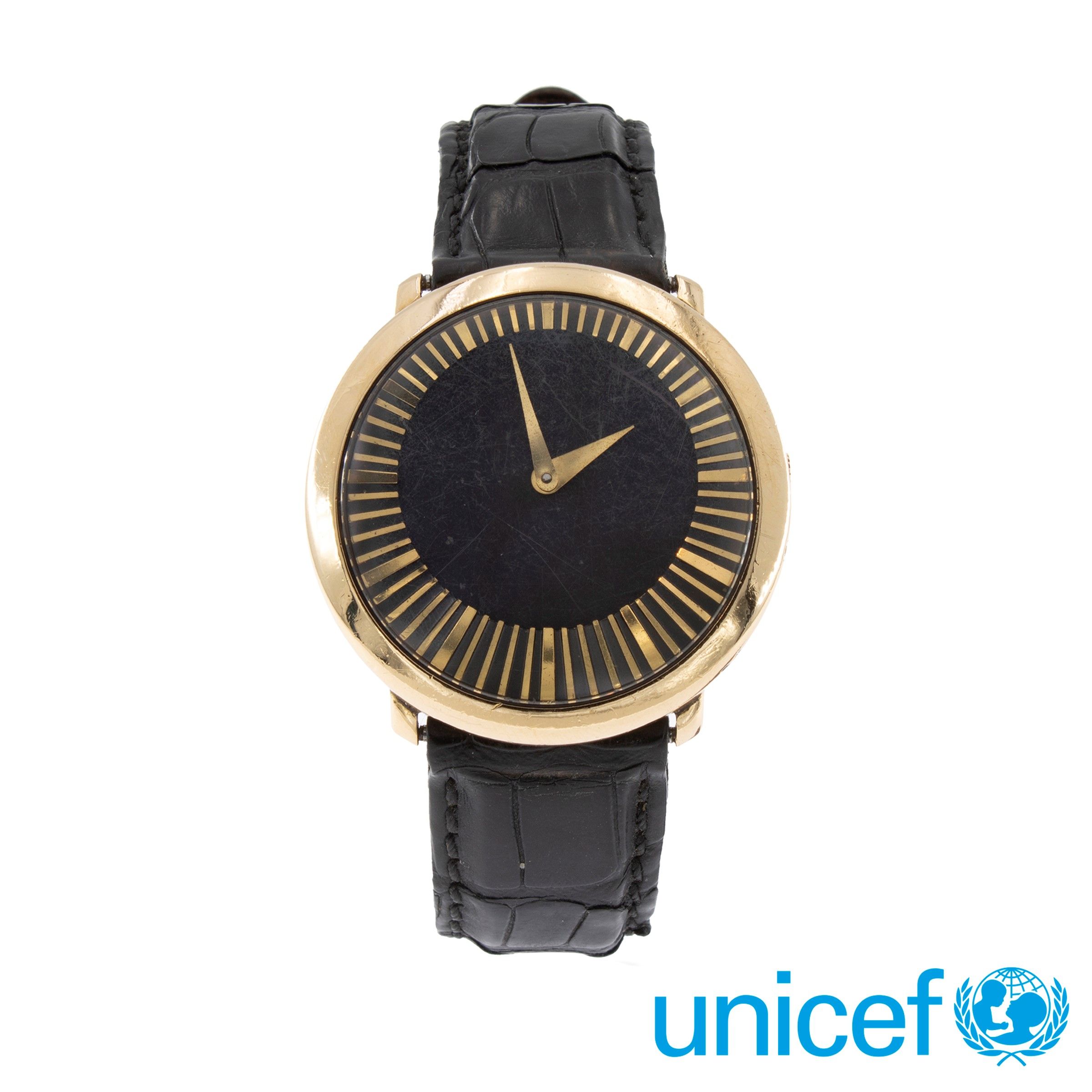 firmato, edizione limitata n. XXIX, 1985 - 1993 in oro giallo 18kt, cassa tonda 30,5 mm. ref. 007390XXIX, quadrante nero, indici dorati disposti a raggiera, movimento al quarzo, cinturino in pelle con fibbia originale in oro giallo 18kt, cassa, quadrante e movimento firmati, completo di custodia in tessuto, cassa, quadrante e movimento firmati