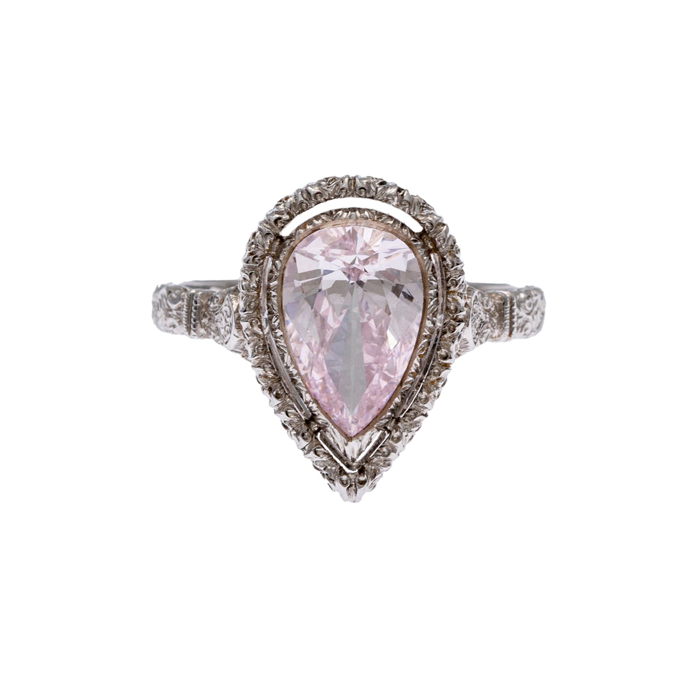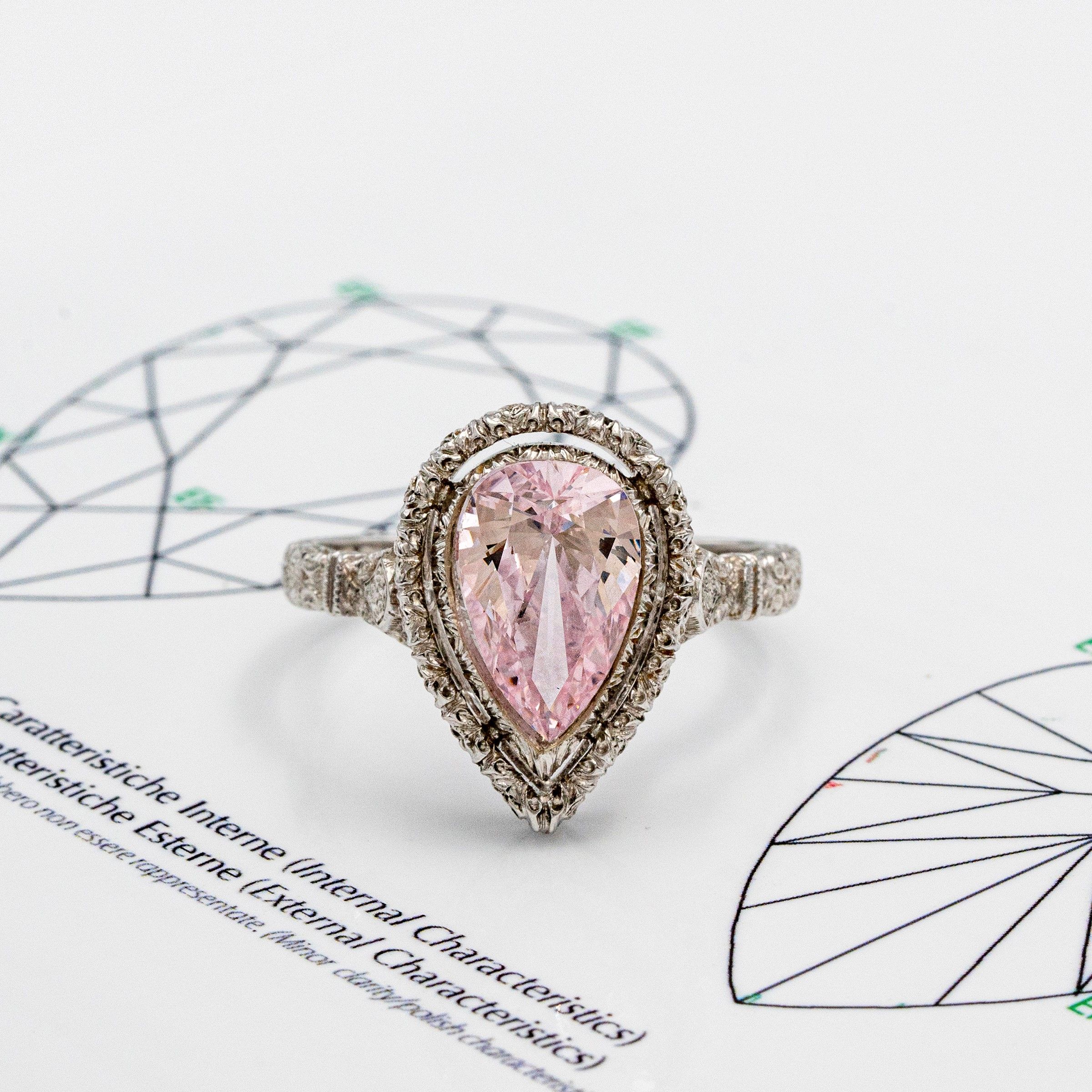 firmato in oro bianco 18kt diamante fancy pink light taglio a goccia ct 1,84 circa, purezza VVS2, completo di certificato gemmologico, misura 17