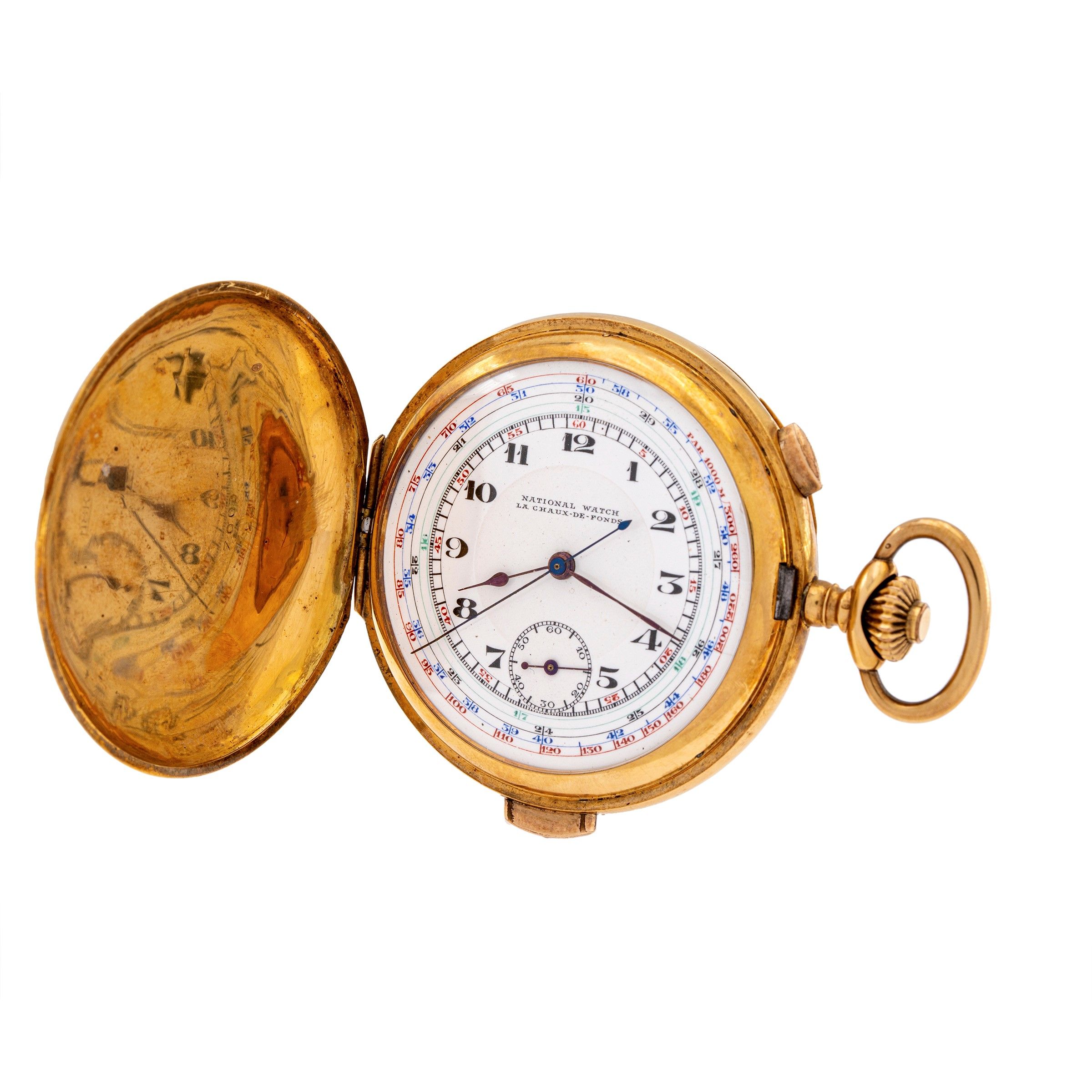 peso 95 gr. primi 900 savonette con cronografo e ripetizioni ore e quarti, in oro giallo 18kt, cassa a quattro corpi, diametro 5,3 cm. quadrante in smalto bianco con numeri arabi, contasecondi ore 6, movimento meccanico a carica remontoir