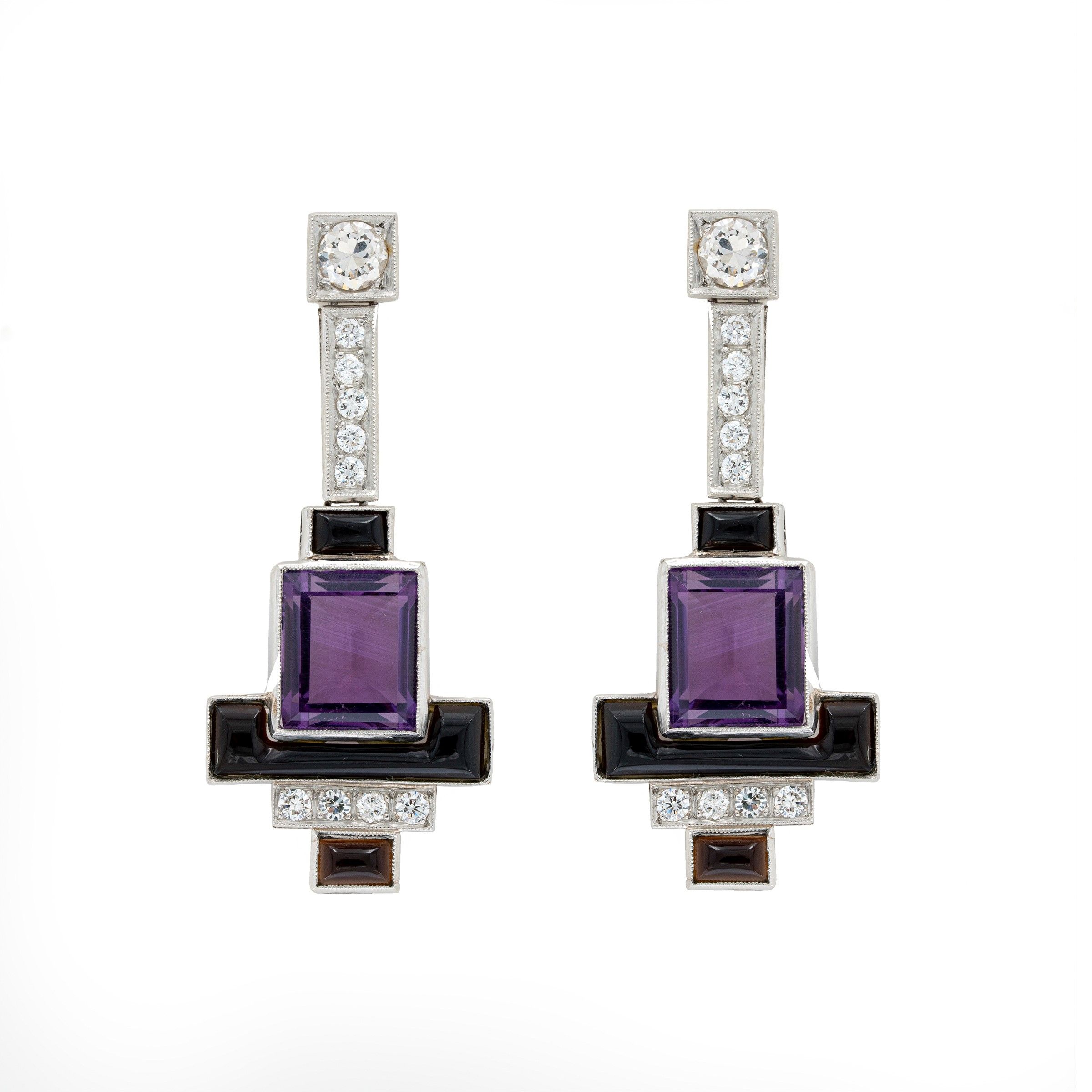 Orecchini Decò pendenti in platino ametista, onice nero e diamanti