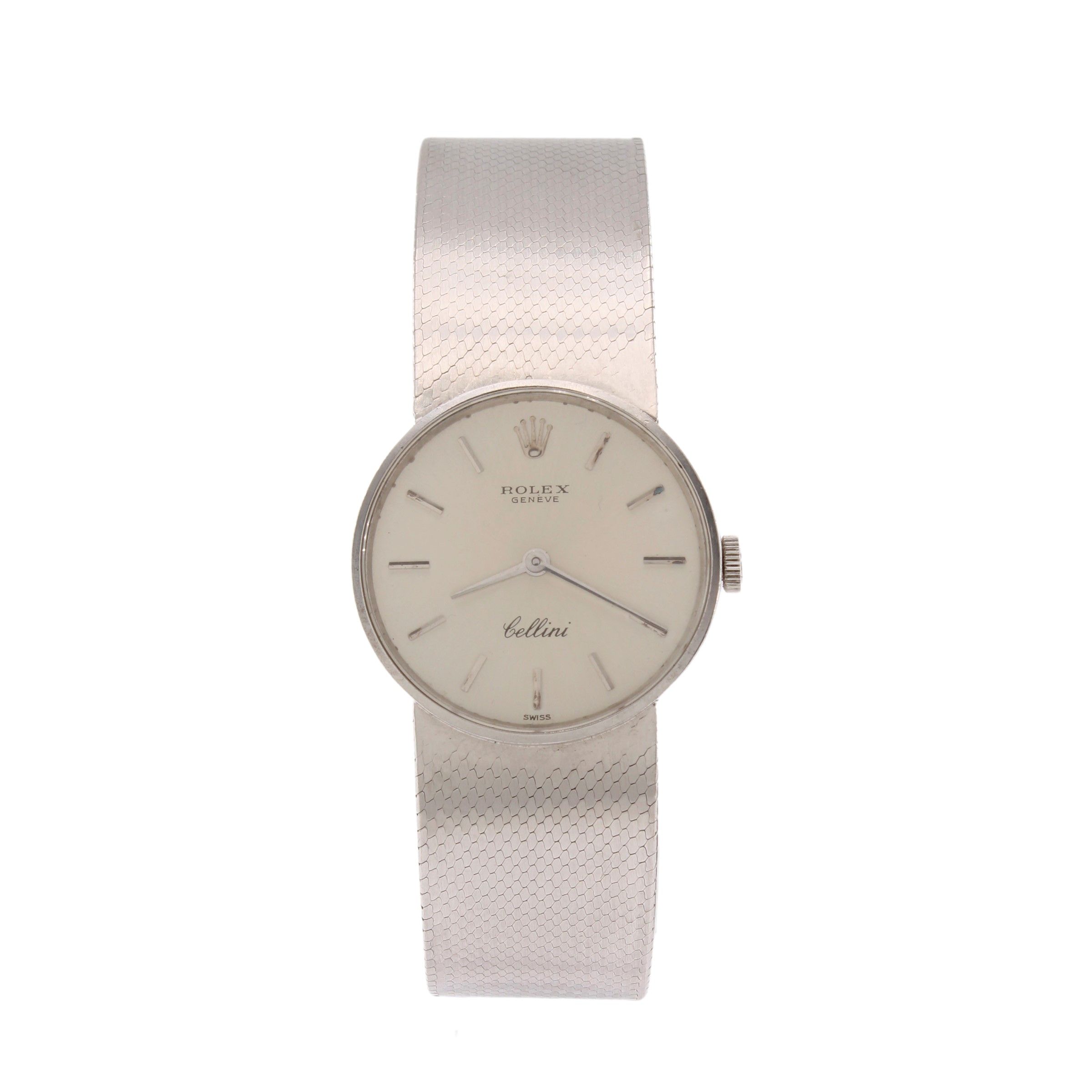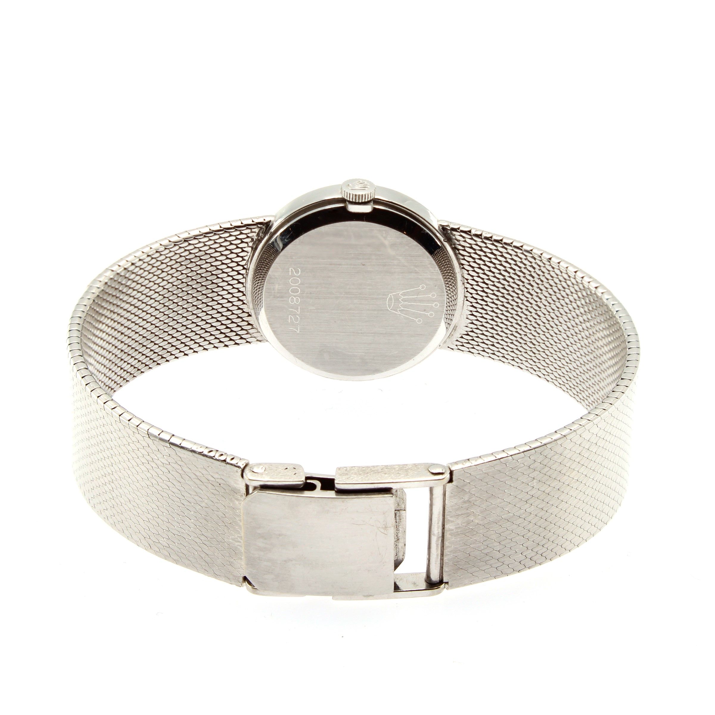 peso 60 gr. anni 60/70 in oro bianco 18kt, ref. 3810 - 2008727, cassa tonda 24 mm. quadrante argentato con indici, vetro zaffiro, movimento meccanico a carica manuale, calibro 1600, completo di bracciale originale a tessuto in oro bianco 18kt, lunghezza 16 cm. cassa, quadrante e movimento firmati