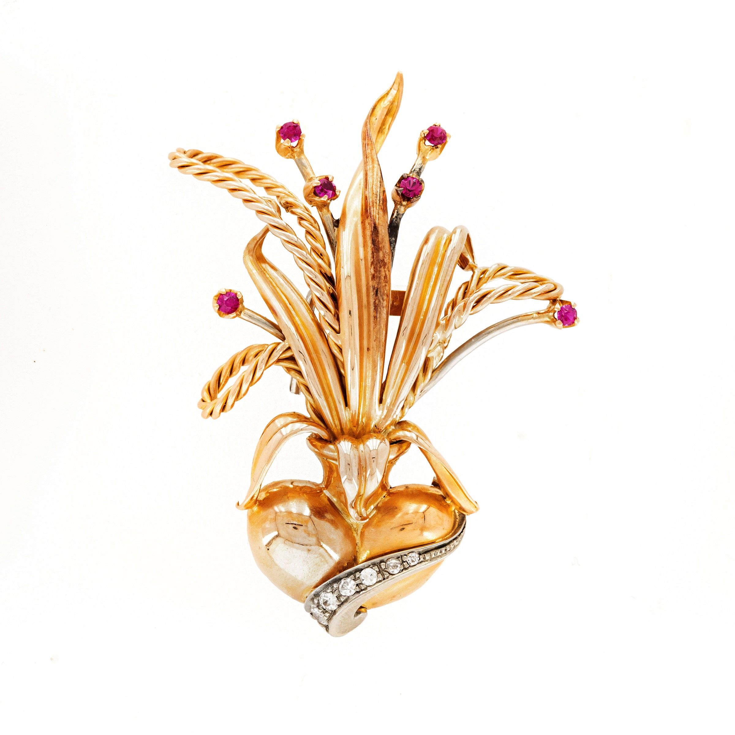 anni 50/60 rubini e diamanti taglio brillante montati su oro bianco, dimensioni 5,3x3,5 cm.