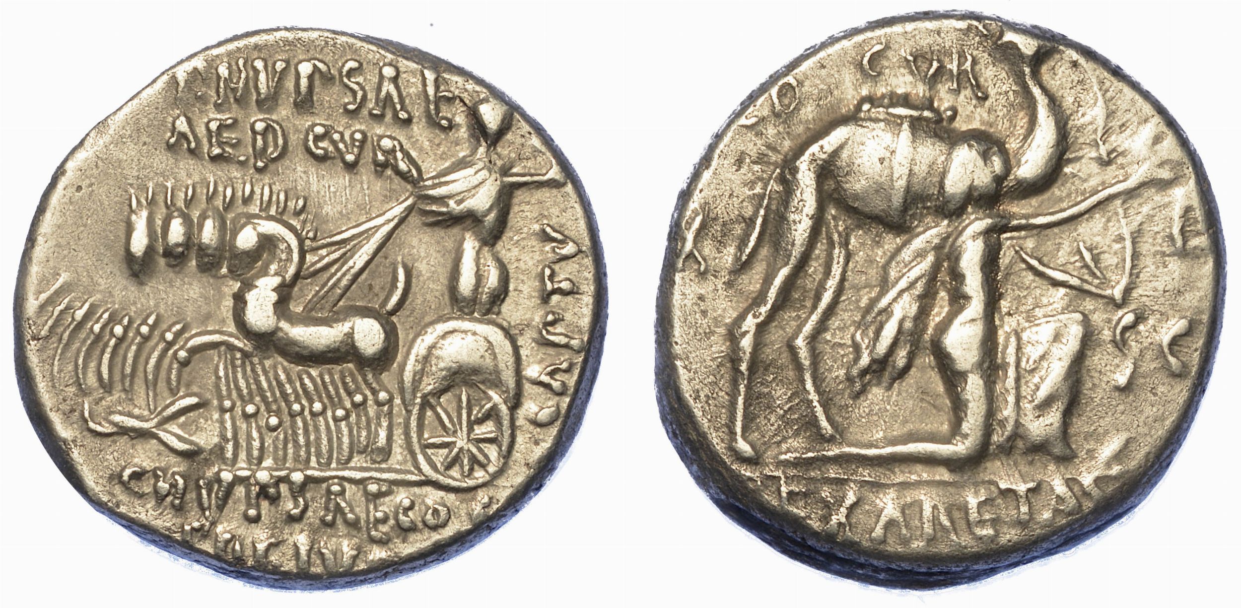 AEMILIA. M. Aemilius Scaurus, P. Plautius Hypsaeus, 58 a. C. Denario.