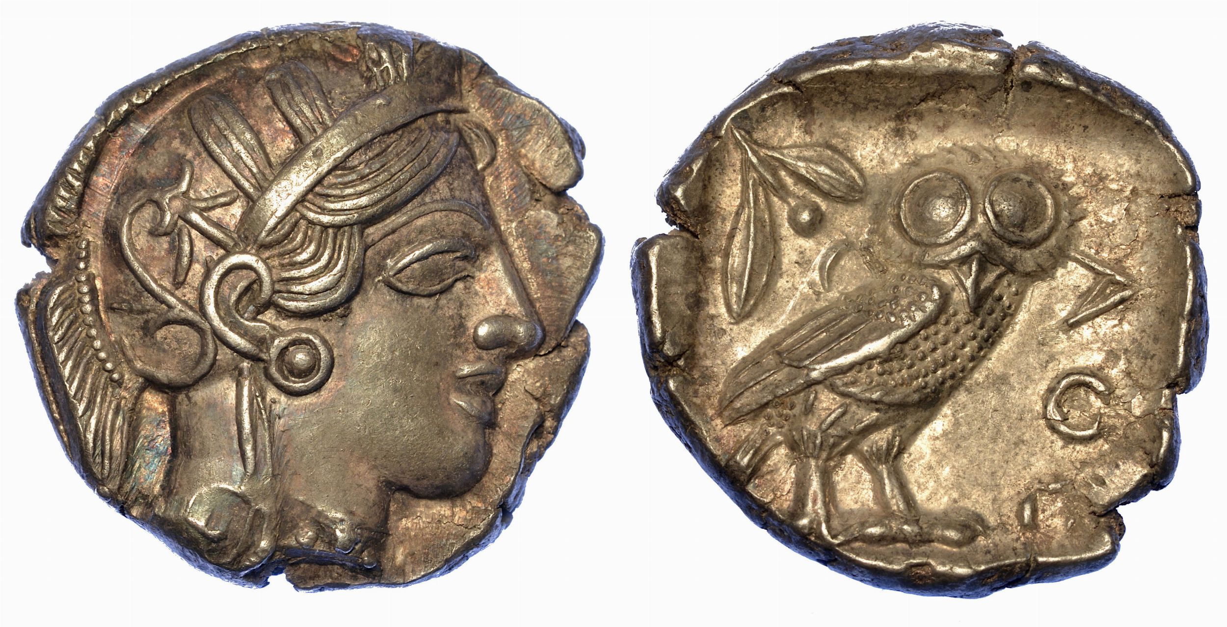 Testa di Athena a d. R/ Civetta a d.; dietro, crescente lunare e ramo di ulivo. SNG. (Cop.) 37. BMC. 62. g. 17,10. Diam. mm. 24,73. Arg. SPL