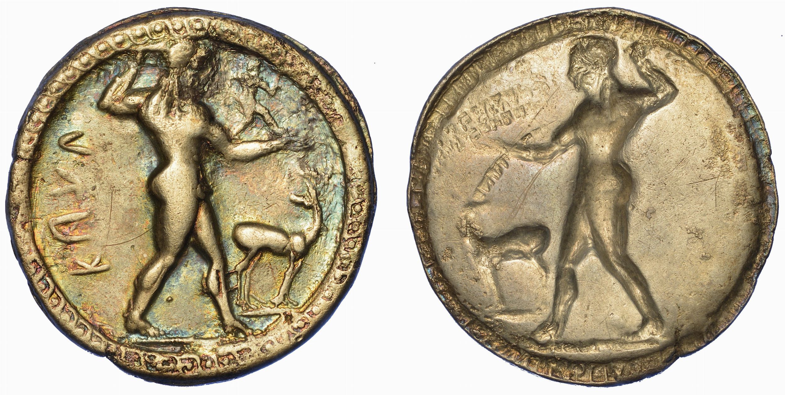 Apollo Catharsio avanza verso d. e regge ramo di palma; sul braccio, piccolo demone retrospiciente in movimento; ai lati KAVL e cervo. R/ Stessa raffigurazione in incuso, tranne che manca la scritta KAVL. SNG (Cop.) 1698var. g. 7,52. Diam. mm. 31,04. Arg. Modulo largo, graffi e patina azzurro iridescente. BB