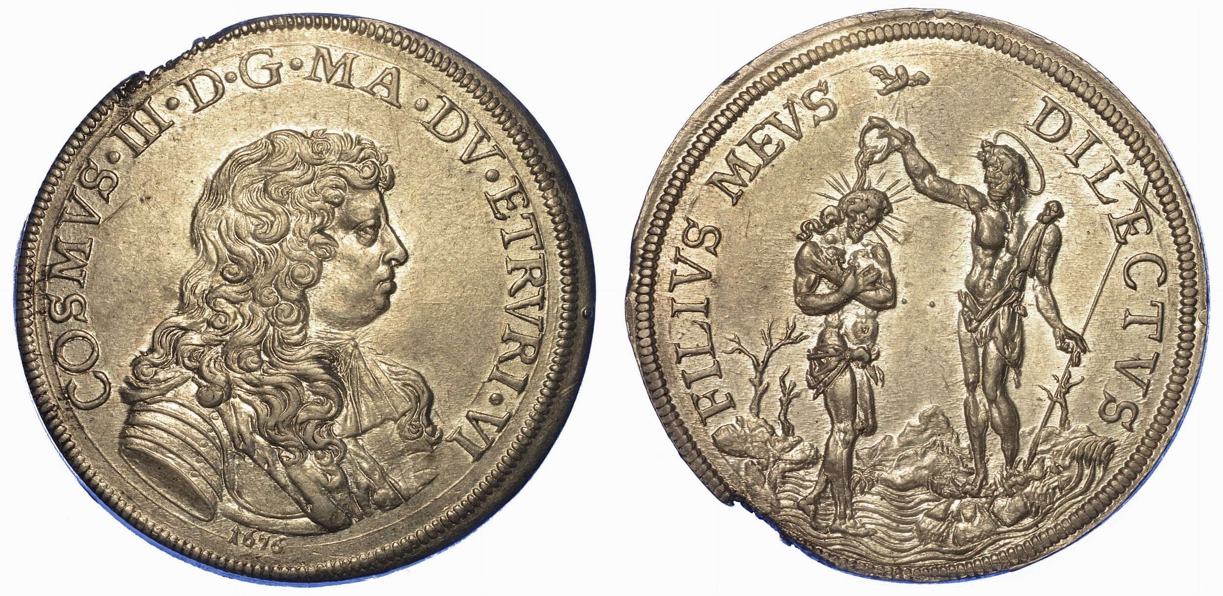 Busto paludato e corazzato del Granduca a d. R/ La scena del battesimo di Gesù Cristo. MIR 326/3. g. 31,12. Diam. mm. 44,85. Arg. Strappo di conio sul bordo. Di notevole freschezza. q.FDC