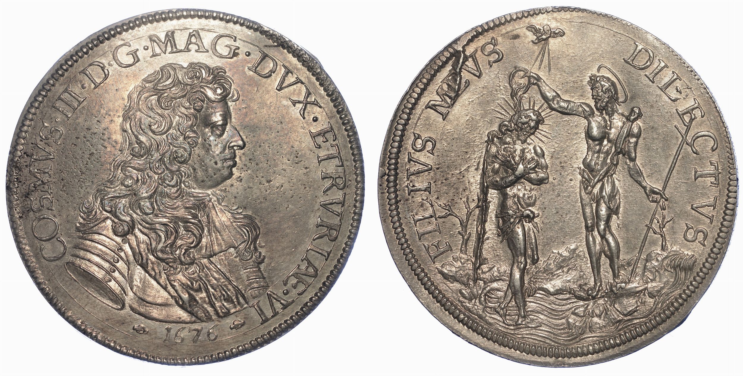 Busto paludato e corazzato del Granduca a d. R/ La scena del battesimo di Gesù Cristo. MIR 326/3. g. 31,12. Diam. mm. 44,74. Arg. Consuete irregolarità di conio, brillante patina iridescente. Esemplare di eccezionale freschezza. q.FDC