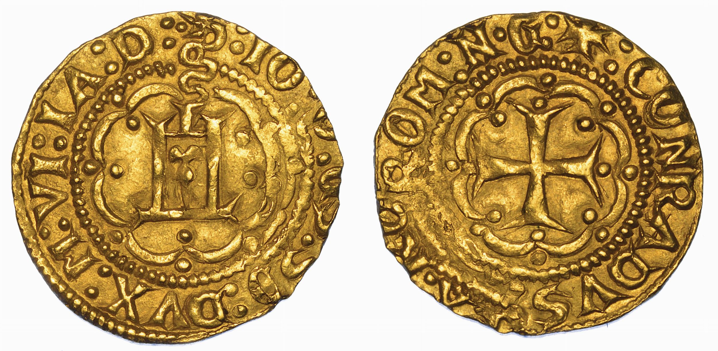 Castello sormontato da biscione. R/ Croce patente entro cornice di archetti. MIR 132/4. CNI 11-13. Rarissimo. g. 3,50. Diam. mm. 20,73. Oro. Lievi segni di ribattitura al rovescio. BB