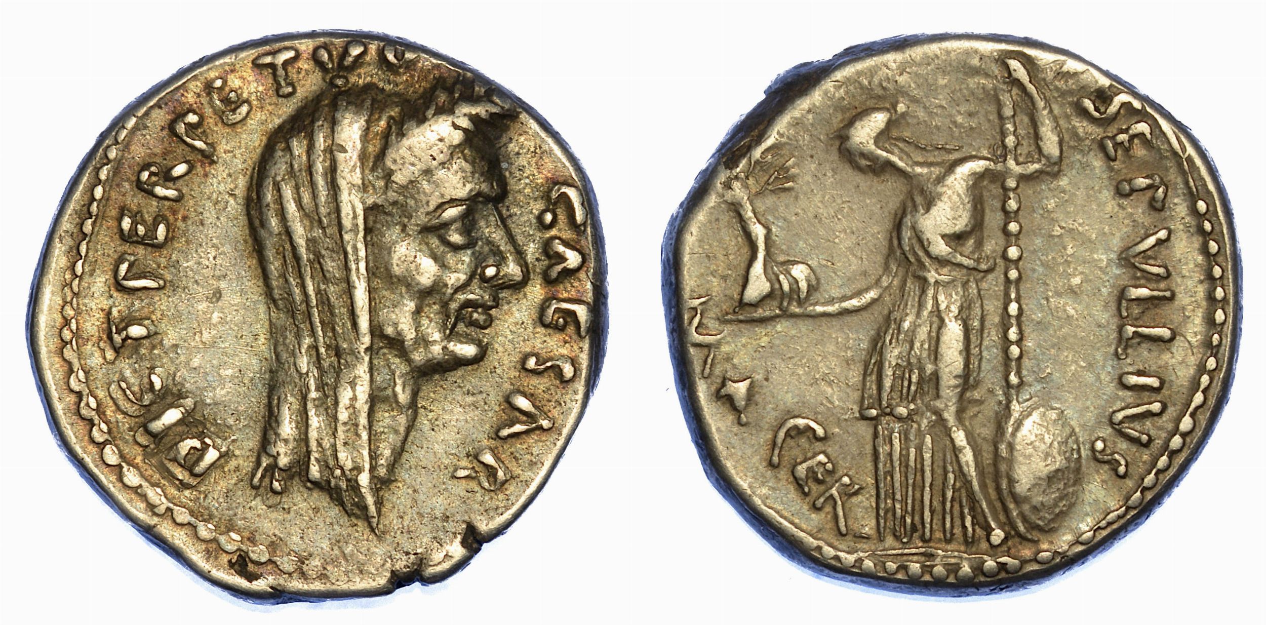 GIULIO CESARE - P. SEPULLIUS MACER. Denario, anno 44 a.C.