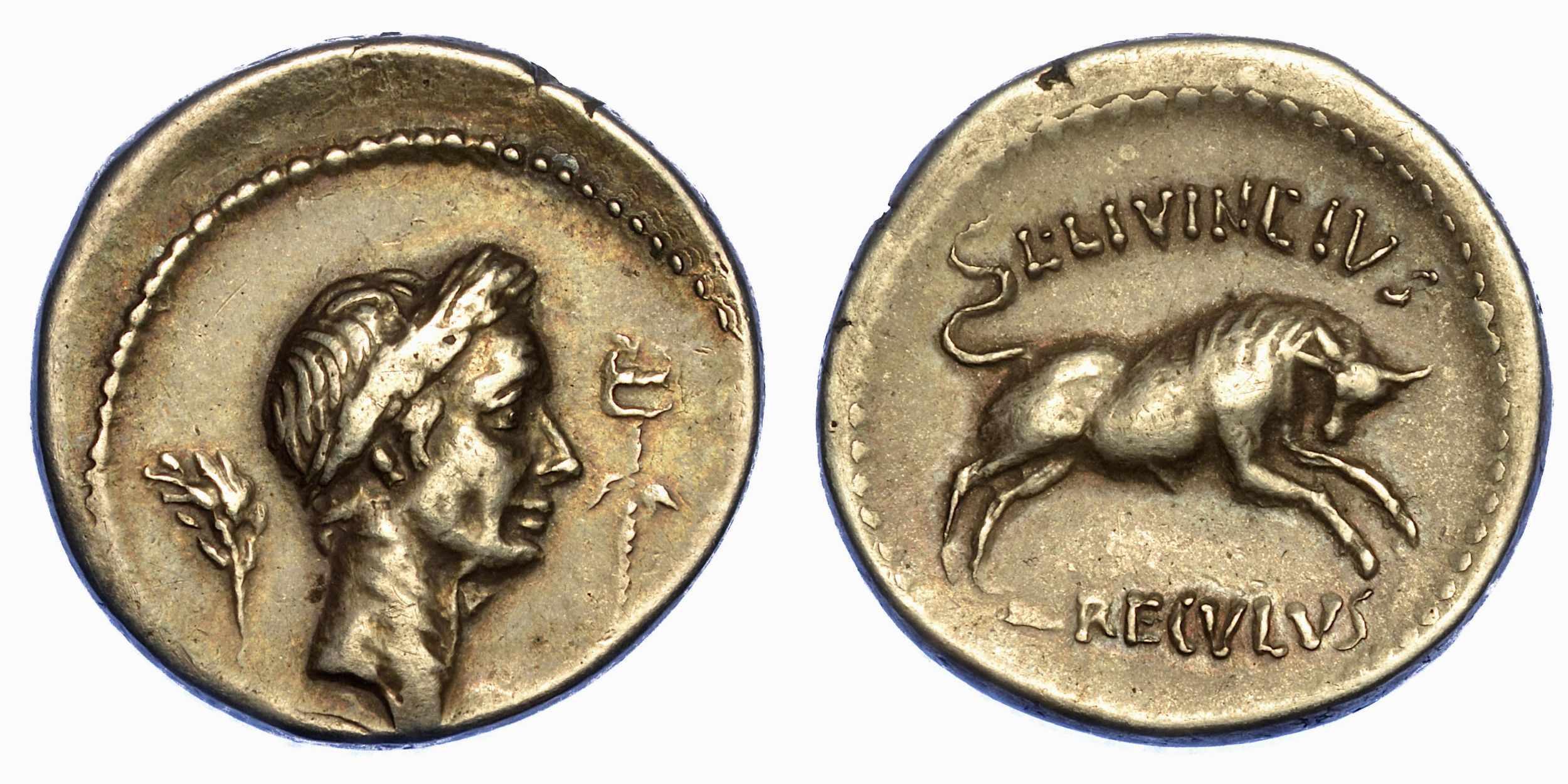 Testa laureata di Cesare a d.; dietro, ramo di alloro; davanti, caduceo. R/ Toro alla carica verso d. Bab. Julia 57 and Livineia 1. Syd. 1106. Sear Imperators 115. Cr. 494/24. Molto raro. g. 3,65. Diam. mm. 18,06. Arg. BB