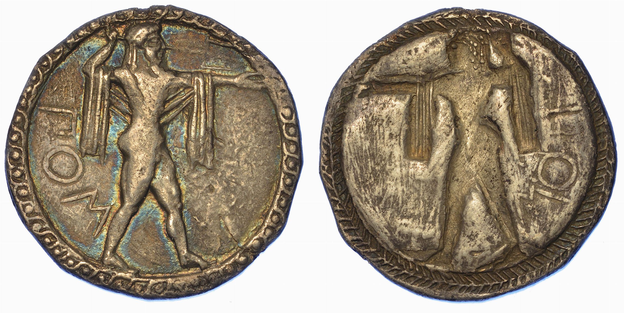 Poseidone in piedi a d., barbuto, diademato e nudo, tiene la clamide sulle spalle, nell'atto di scagliare un tridente. Sulla s. la scritta POM in lettere greche. R/ La stessa figura in incuso; la scritta POM é incisa. SNG (Cop.) 1271. g. 7,13. Diam. mm. 26,94. Arg. Gradevoli riflessi di patina azzurri. BB/q.SPL