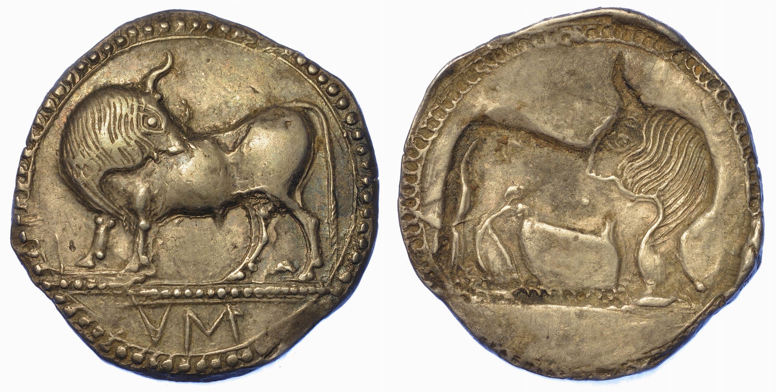 Toro in piedi a s. retrospiciente; in esergo, VM. R/ La stessa figura, in incuso. SNG (Cop.) 1388. g. 8,11. Diam. mm. 29,43. Arg. SPL