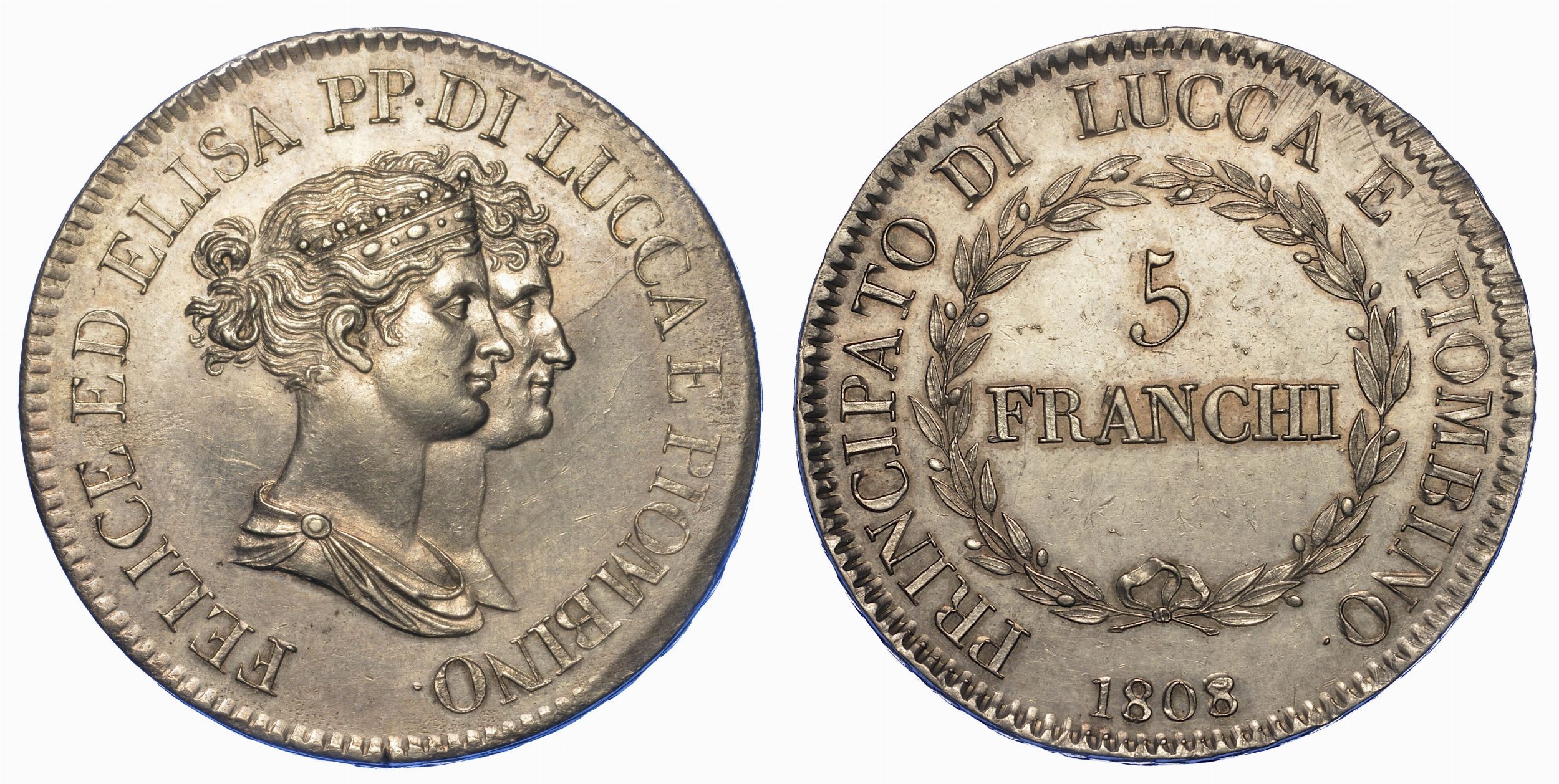 LUCCA. ELISA BONAPARTE E FELICE BACIOCCHI, 1805-1814. 5 Franchi 1808.