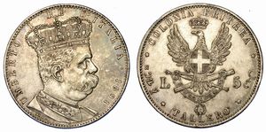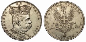 Testa a s. R/ Sullo sfondo una nave con festoni e scudo sabaudo; in primo piano, due figure rappresentanti l'Italia [..]