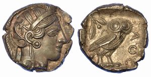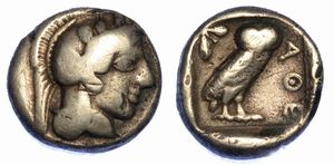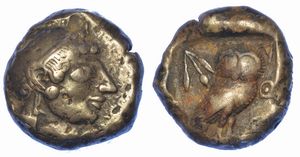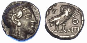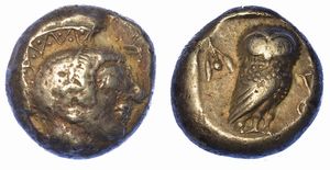 Testa di Athena a d. R/ Civetta a d.; dietro, crescente lunare e ramo di ulivo. SNG. (Cop.) 37. BMC. 62. g. 17,10. [..]