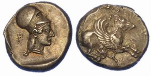 Testa di Athena a d. R/ Civetta a d.; dietro, crescente lunare e ramo di ulivo. SNG. (Cop.) 37. BMC. 62. g. 17,10. [..]