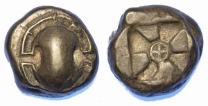 Scudo beotico. R/ Testa barbuta di Dioniso a destra, con indosso una corona di edera. BCD Beozia 438 var. SNG [..]