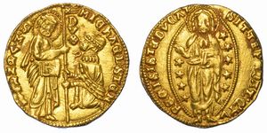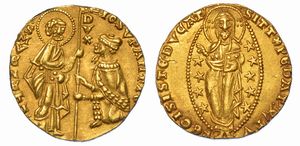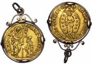 Leone di San Marco, alato e nimbato, verso d. e doge genuflesso con stendardo verso s.; in esergo, F A P (Francesco [..]