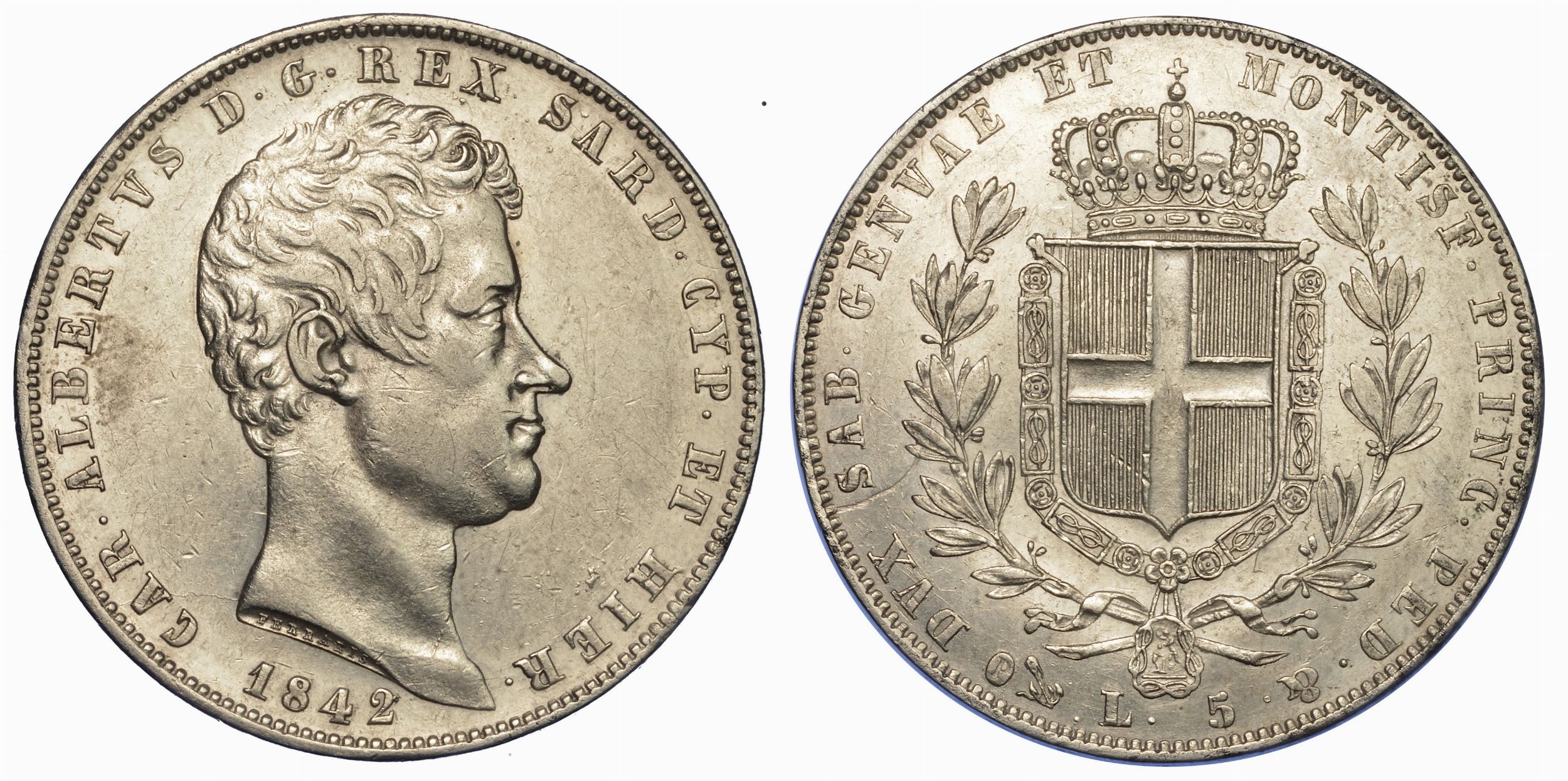REGNO DI SARDEGNA. CARLO ALBERTO DI SAVOIA, 1831-1849. 5 Lire 1842. Genova.