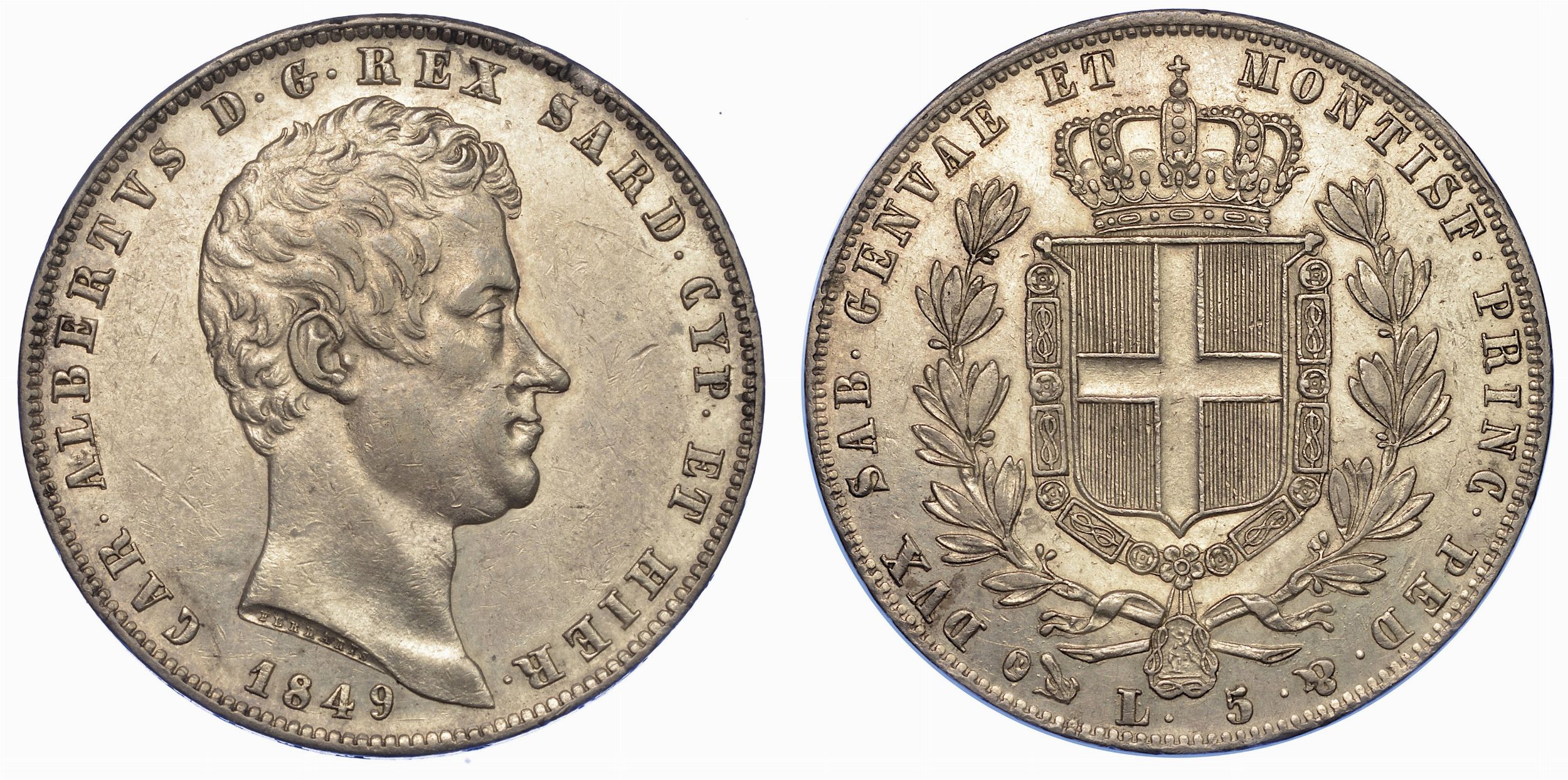 REGNO DI SARDEGNA. CARLO ALBERTO DI SAVOIA, 1831-1849. 5 Lire 1849. Genova.