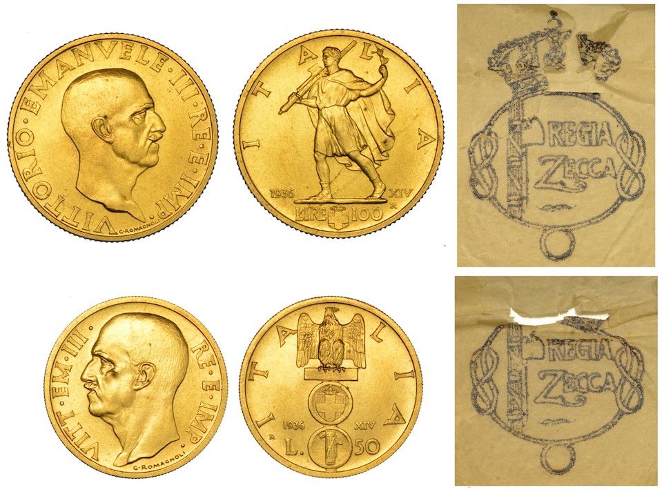 100 lire 1936/A. XIV. Impero. Testa nuda del sovrano a d. R/ Figura intera di littore rivolto a s., con vittoria alata e fascio littorio. Gig. 13. Pag. 650. Molto raro. g. 8,79. Diam. mm. 23,58. Oro. FDC (lievissime irregolarità di conio) - 50 Lire 1936. Impero. Testa del Re a s. R/ Insegna imperiale con aquila e scudo sabaudo. Gig. 24. Molto raro. g. 4,40. Diam. mm. 20,54. Oro. FDC