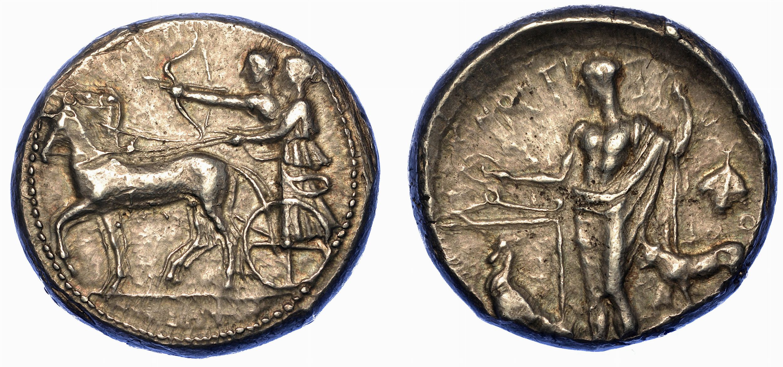 Artemide guida la quadriga verso s.; accanto a lei, al suo fianco, Apollo, tende l'arco. R/ Selinus in piedi tiene un ramo e una phiale sopra l'altare a s.; davanti all'altare, gallo; a d., foglia di prezzemolo sopra un toro. Rizzo, XXXI,18. g. 17,31. Diam. mm. 25,23. Arg. Migliore di BB